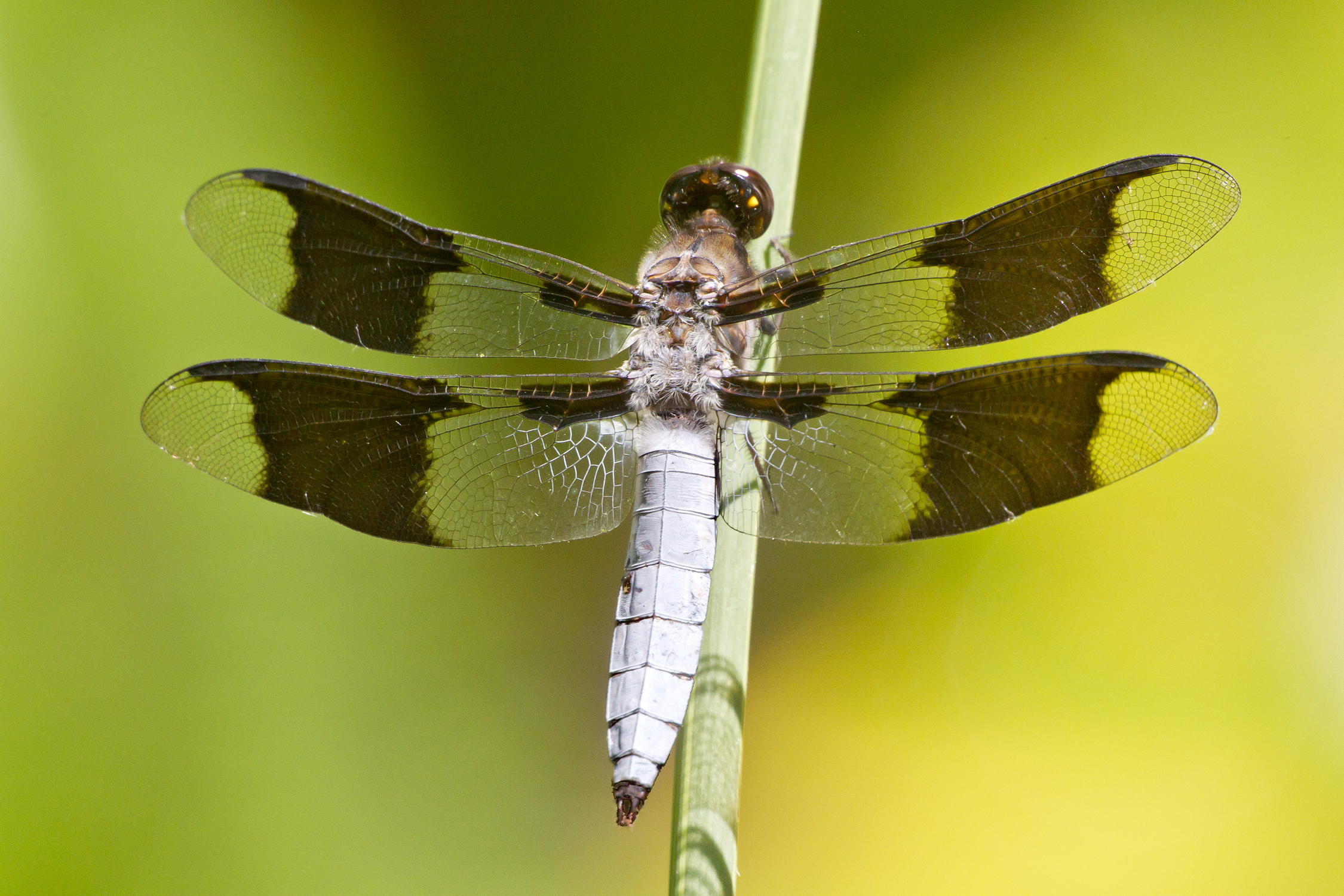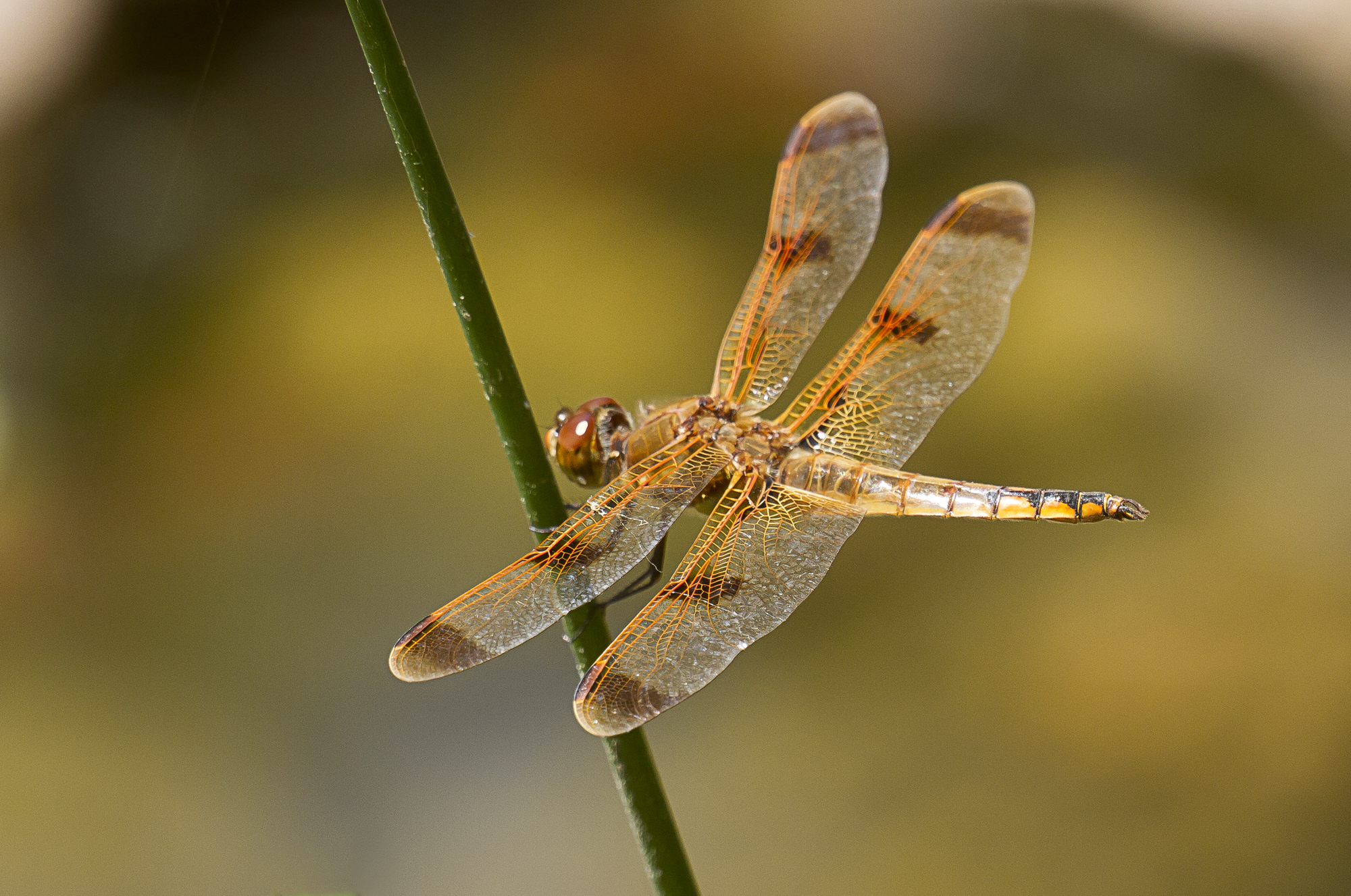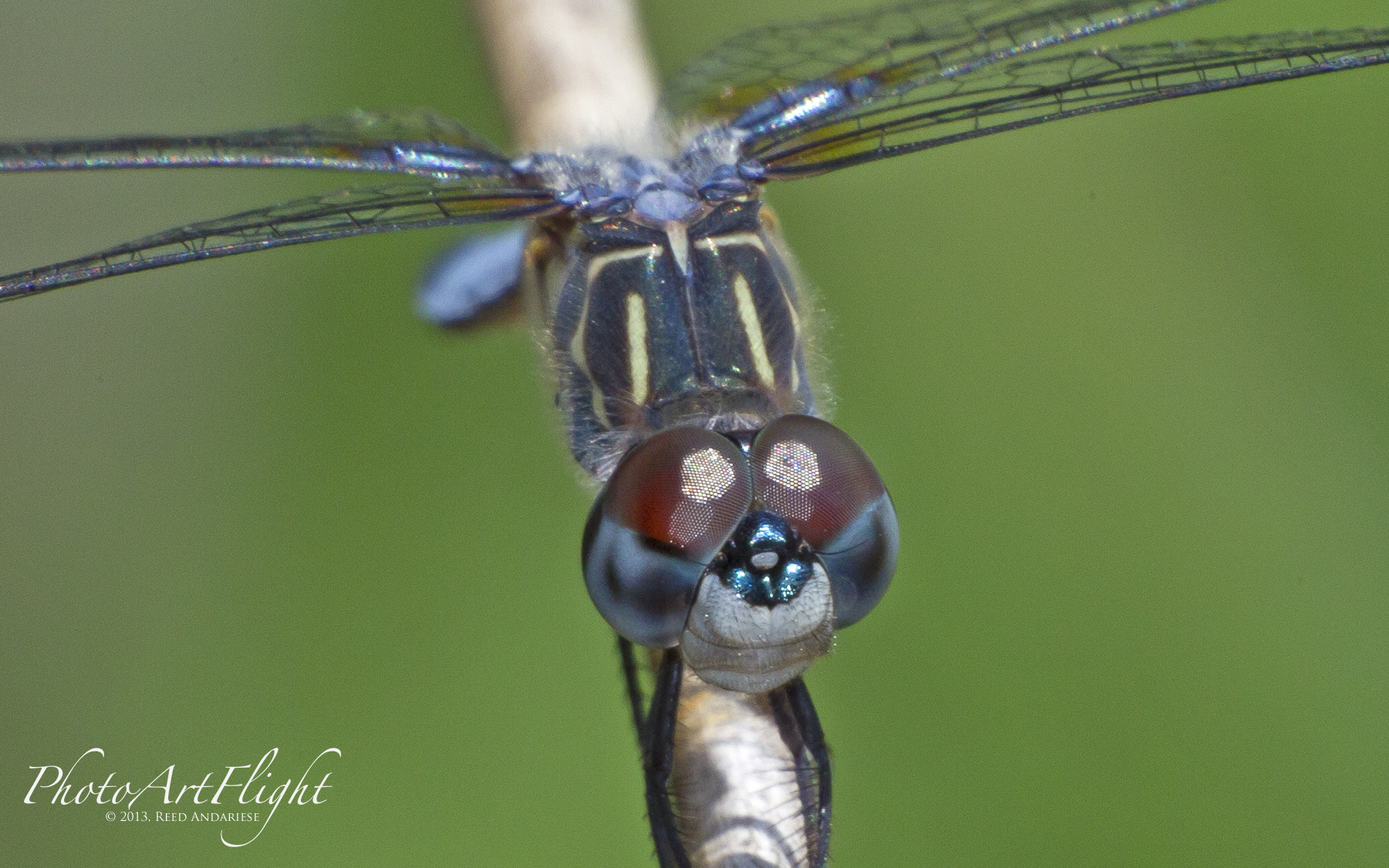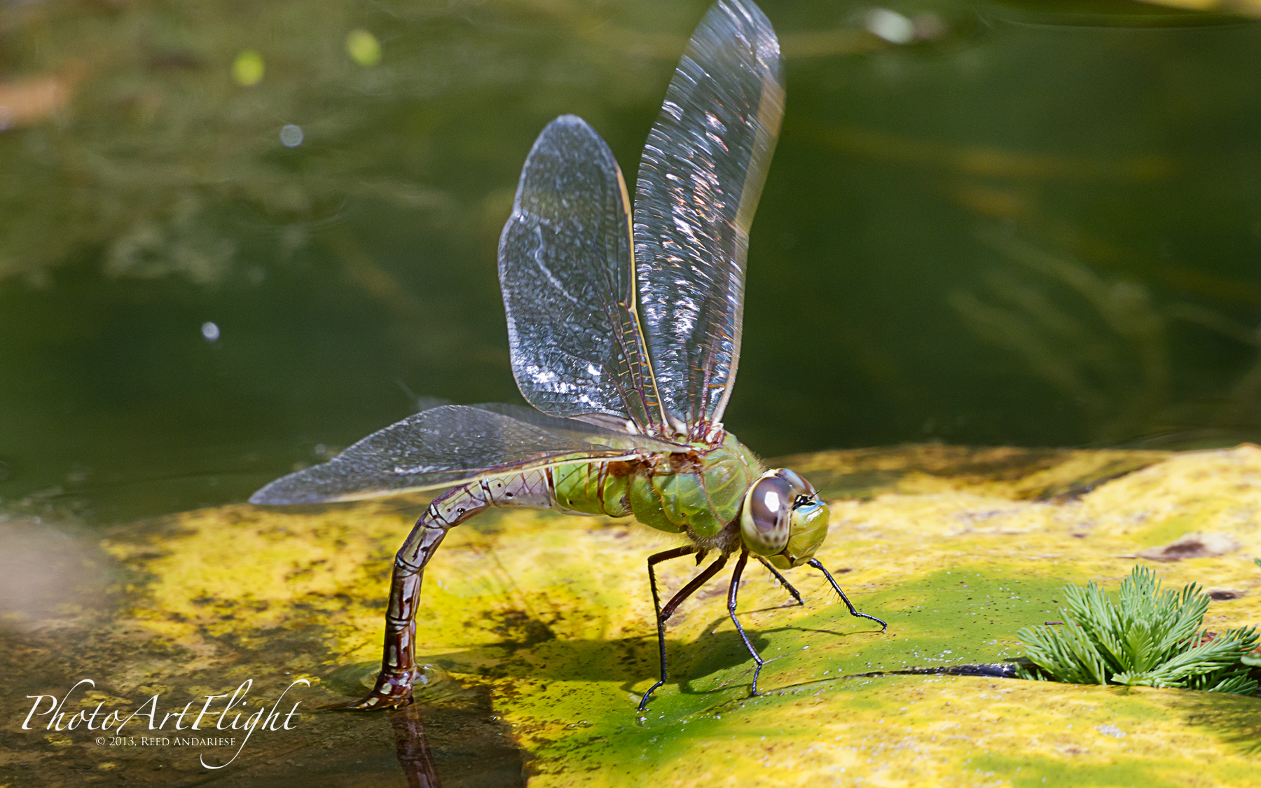 Our backyard pond is one of my favorite locations for photographing dragonflies. Even though it is a controlled area that I shoot in, I still cannot use a standard macro lens, because they’re about 8 to 10 feet away, with water between us. Also dragonflies are skittish if you get too close. They do seem to get used to you after a while, but are still wary of your presence. Sometimes they land on the end of my lens, I guess they are keeping me company. Also using a macro lens in the normal 50mm to 100mm range you have a greater depth of field, which makes it harder to achieve a smoother non distracting or busy looking background behind the dragonfly. I have come up with my own combination of accessories to achieve the results I am looking for. I used a Canon EOS 1D Mark IV with a 400 mm F/4 DO lens, with a 1.4 teleconverter with two extension tubes. The trick for getting the magnification needed for a 400mm telephoto lens, besides close focusing is to have the lens, then, a 36 mm extension tube, then the teleconverter, and then a 20 mm extension tube, and finally the camera body. This actually magnifies the image slightly so it is larger on the sensor than just using one extension tube behind the teleconverter. Also it allows a closer minimum focus with more magnification. Depending on the brand of extension tubes, you might loose accurate metering, so check your exposure with your histogram & adjust your exposure appropriately. Also remember not to underexpose your images, which tends to increase noise in your shadows & the dark areas of the dragonfly and in the background. These were photographed without fill flash, which I usually use to open up the shadows & dark tones. This time I just opened up the shadows a little while adjusting my files. When using a fill flash with a Better Beamer Flash extender or similar, I usually adjust the flash to -1 stop to – 1/3 stop so as not to overpower the ambient light, which would look unnatural. Depends on how harsh the light is, and backlit or front lighting. Also fill flash is important and needed when you go on and try to photograph these fun subjects flying. Opens up a new set of problems and solutions. But that is for another blog. Thanks and visit again soon.