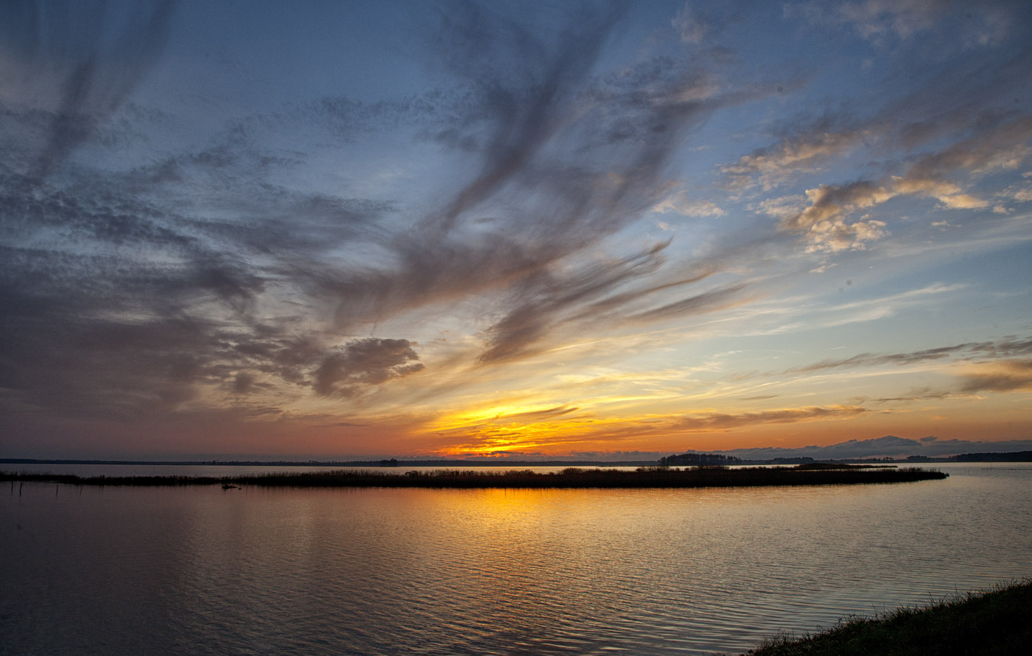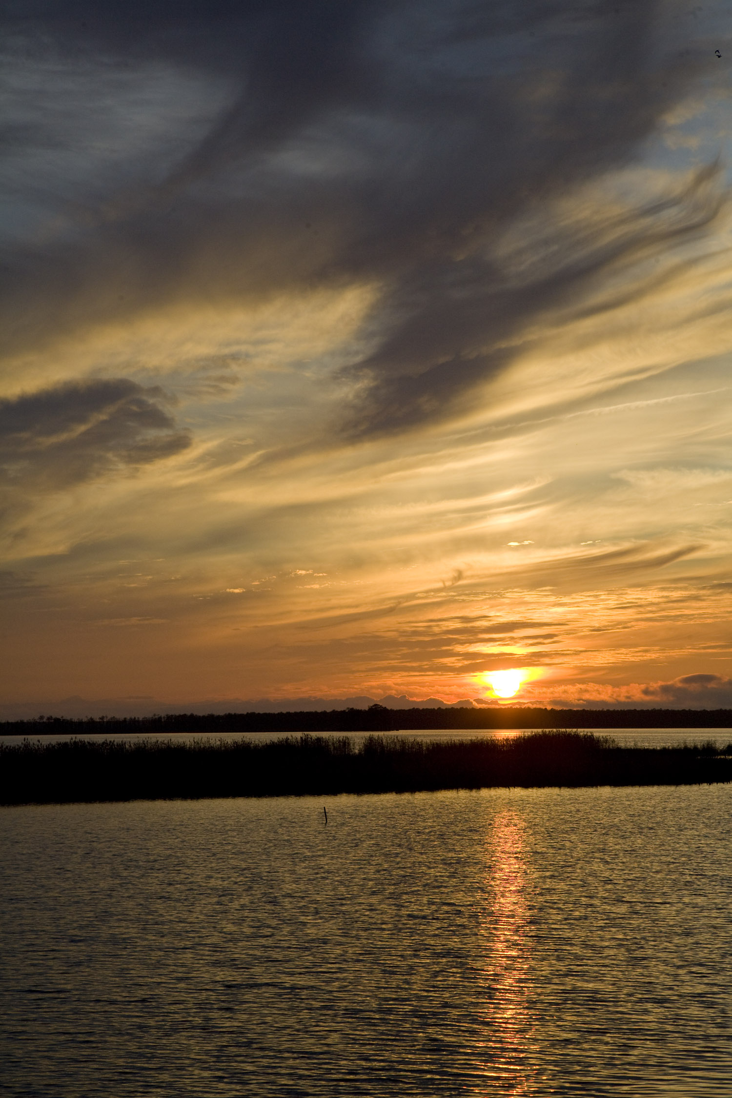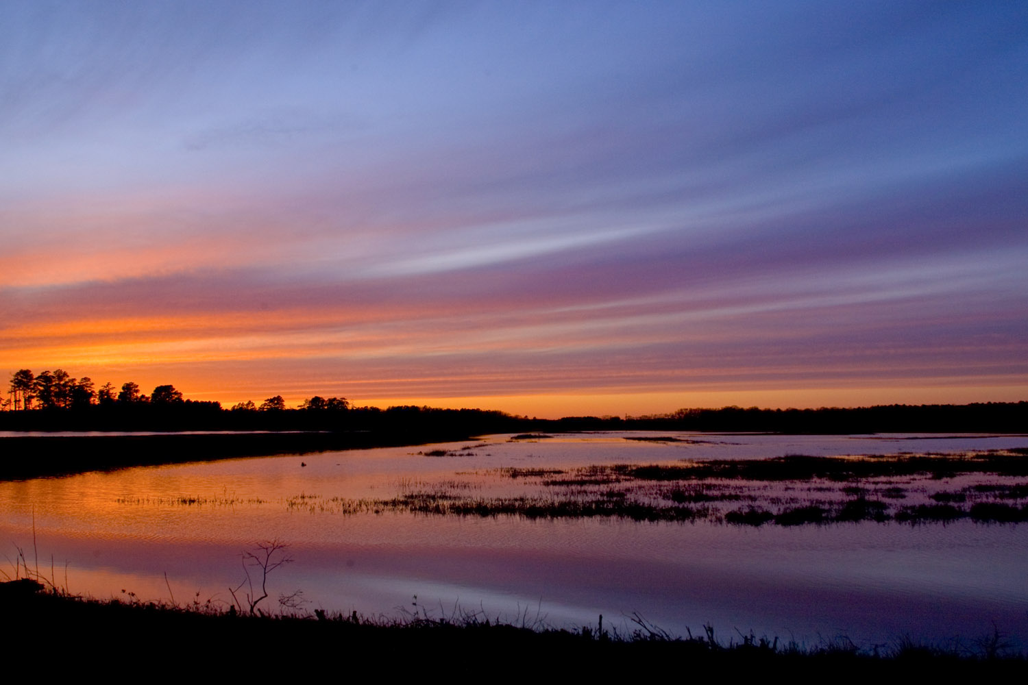 Blackwater National Wildlife Refuge is located on the Eastern Shore of Maryland outside of Cambridge. We usually go there for the wildlife, it has one of the largest concentrations of Bald Eagles on the East Coast along with a wide variety of mammals & birds. But because of its location, Sunrises and Sunsets can be spectacular with amazing colors. There can also be changes in weather with storms rolling in or heavy fog in the morning. In this blog I am concentrating on Sunrises & Sunsets. I use mostly Canon equipment so these are captured with either the 24-105 f/4L, 17-40 f/4 L, 28-135 f/5.6 & 400mm f/4 DO ( for birds flying through the colorful sunset or interesting closer compositions of clouds). For sunrises I usually like to be in the entrance area of the Wildlife Drive, either on the first turnoff from the entrance or further down on the turnoff by the new observation platform. This is also a great area in early morning to look for spider webs backlit from the rising sun. For sunsets, I usually like to be near the end of the Wildlife Drive with the line of trees for scale along the bottom of the frame with water in front. Also across the road at the end of the Wildlife Drive is a popular spot. This area helps minimize power lines that might get in your way along with the Loblolly Pines anchoring the frame with the colorful sky. The new Observation Platform near the entrance to the refuge, is a new favorite spot for Sunsets or Cloudscapes. You can add a lot of foreground with reflections going into the Sunset. When photographing Sunsets or Sunrises, try something a little different to help tell a story about your location, not just the usual composition. They tend to help show the location better to someone else, plus it is fun to try other versions. This also helps push your creative eye to see things a little differently. I tend to do this for my ebooks, using them as background images for other photos or text, often coming in handy. From my commercial background, I tend to not use the common rules of composition, instead leaving open space in areas for other placement of images or text.