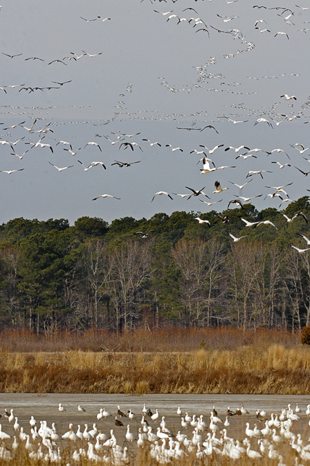 This goes back a couple of years. We were going through the Blackwater National Wildlife Refuge outside of Cambridge Maryland. We mostly go there for Bald Eagles, but a few years ago they had huge flocks of Snow Geese. By themselves, One by One, they did not seem that interesting, but when you see huge flocks of them filling the sky they are quite impressive. You would see thousands of Snow Geese in one group. Sometimes they would lift off in waves, other times they would all go in one group. Needless to say, it was IMPRESSIVE. Plus the sound of thousands of birds, you could hear them from the other end of the Drive. Sadly, last year, we did not even see one there. We heard they moved to an island off the refuge. We are hoping they will return someday.