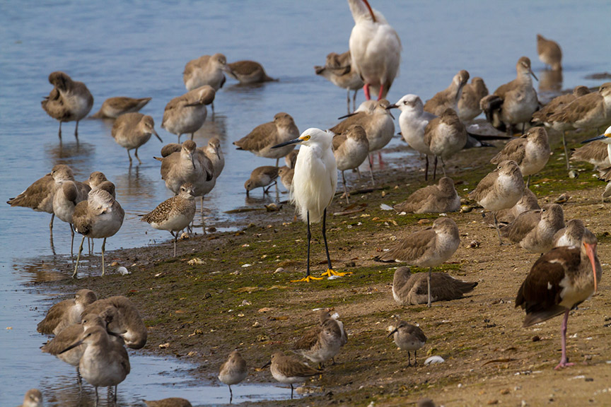 This Snowy Egret stood out against the shorebirds and seemed to look a little lonely. He stayed there for quite a while until more shorebirds flew in and the Snowy moved on.