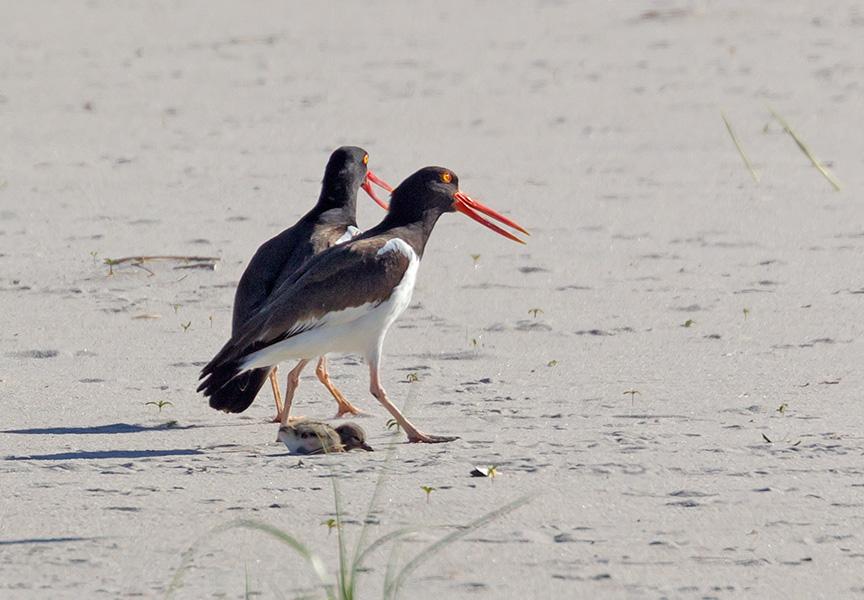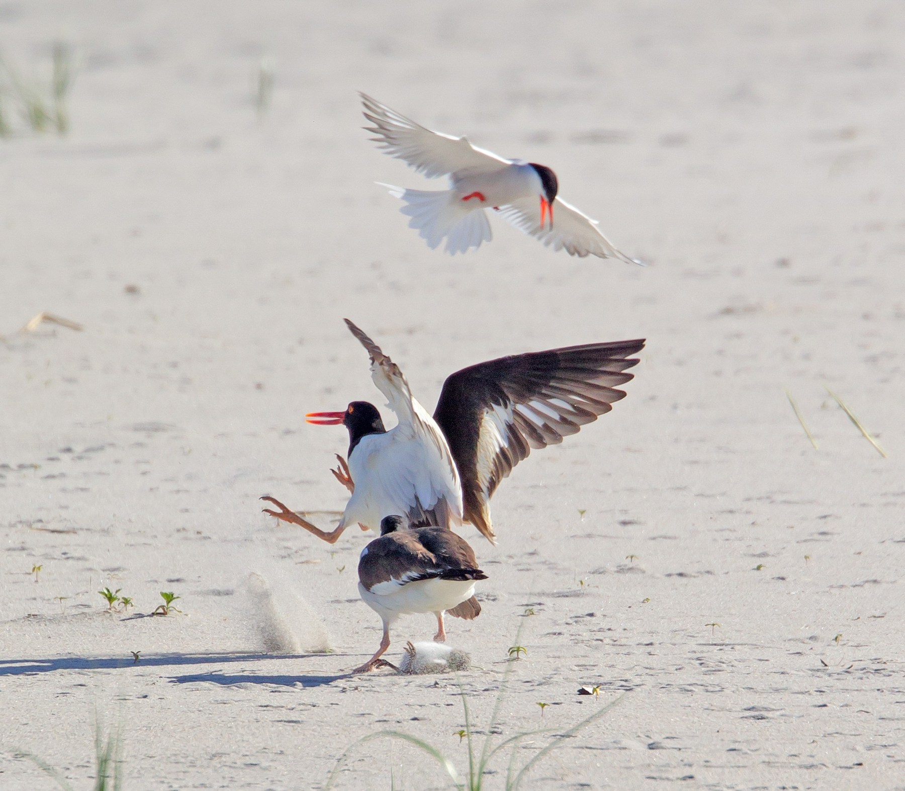 This family of Oystercatchers was wandering across the sand dunes, when all of a sudden a Common Tern seemed very interested in the chicks. It kept diving down to get the chicks, hitting them and trying to get them. The adult Oystercatchers were trying to protect their chicks to a point, but also just wandered off here and there not paying attention to some of the attacks. Some of the chicks got knocked over, but eventually started moving again. All the chicks in this family survived this series of attacks and moved on, but another family of Oystercatchers I was watching lost all three of their chicks to the Terns, so I did not post any of those photos here. All of these are cropped in quite a bit, but thought it was an interesting story showing their survival.
