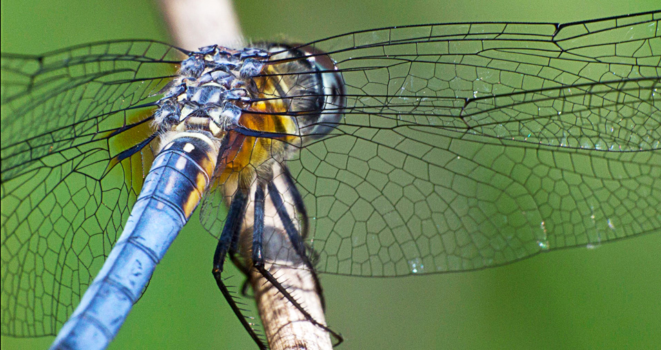 The Blue Dashers are beginning to show up in numbers at the pond. Usually you see the males, females make brief appearances and then chase emm DO f/4 IS stabilized lens with a 25mm extension tube, then a Canon Series III 1.4X Teleconverter, then a 20mm extension tube. This combination, in this order gives you the ability to focus closer, than just using a lens with a teleconverter, then an extension tube. I used a flash with a Better Beamer Flash Extender to be the main light and the ambient light more as a fill light, but kept the background a little darker so the Dasher details stood out. I liked the detail of the wing roots and patterns in the wing.