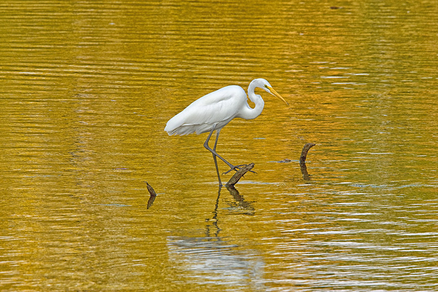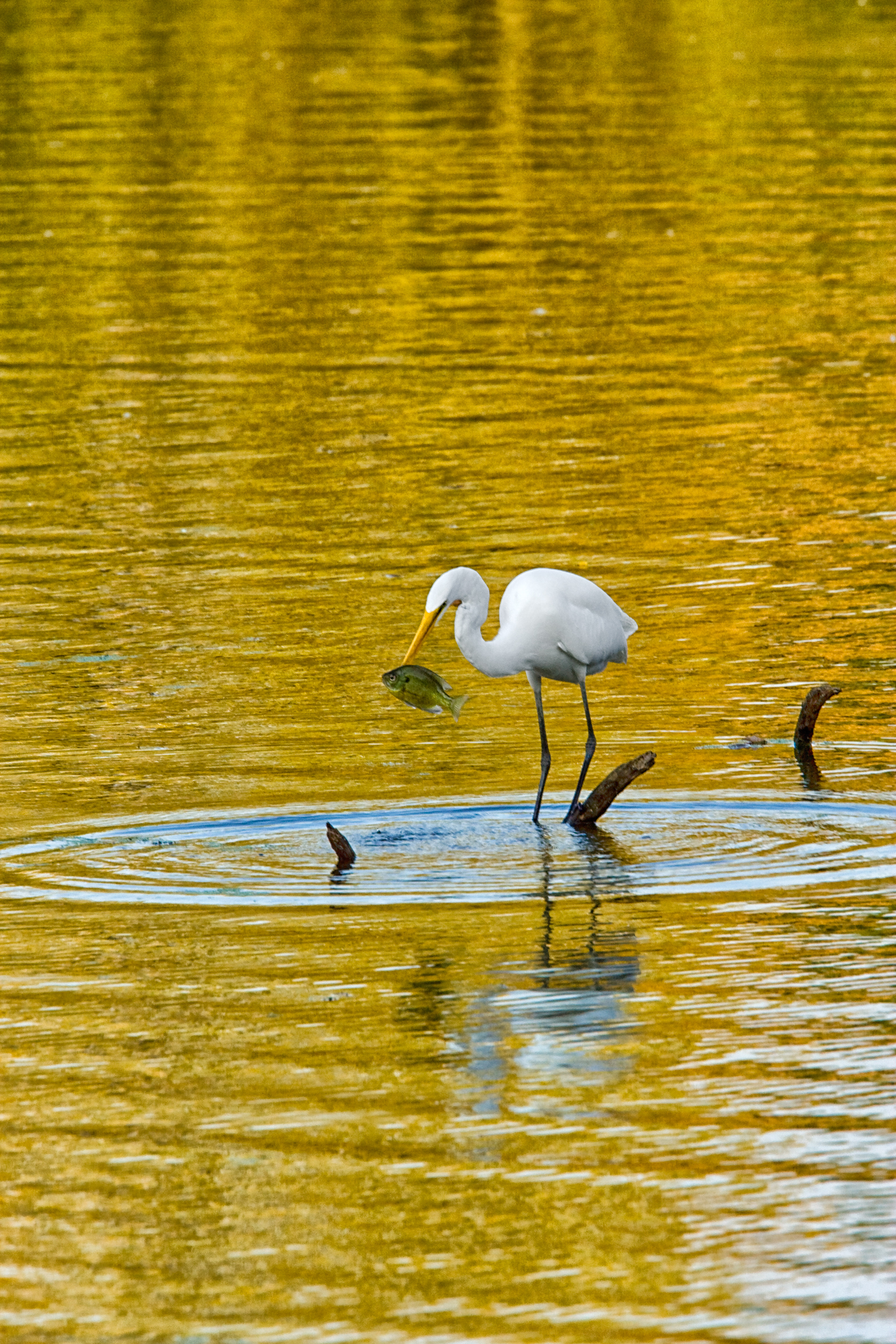 This Great Egret landed on the branch sticking out of the water. Then it started to fish for a meal. It was quite successful with its fishing endeavors. When finished the Egret flew off.