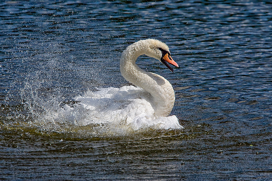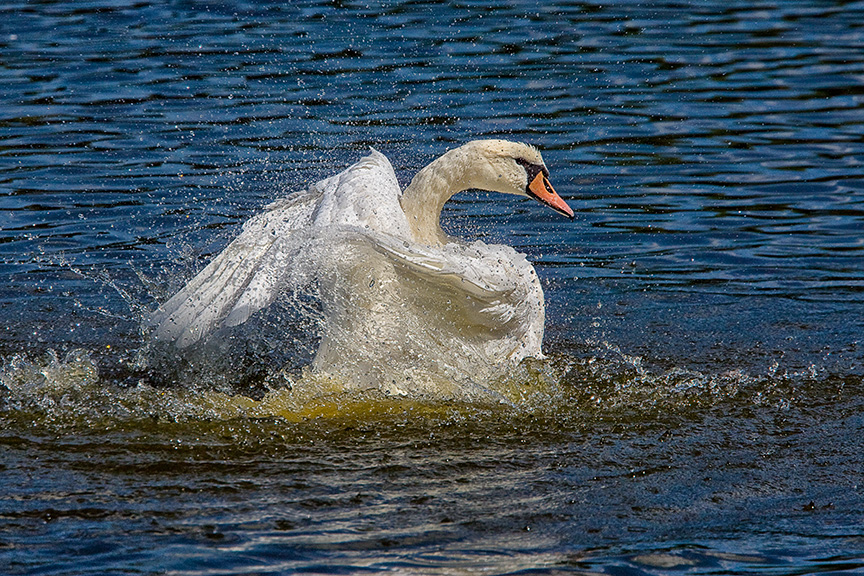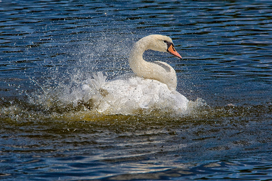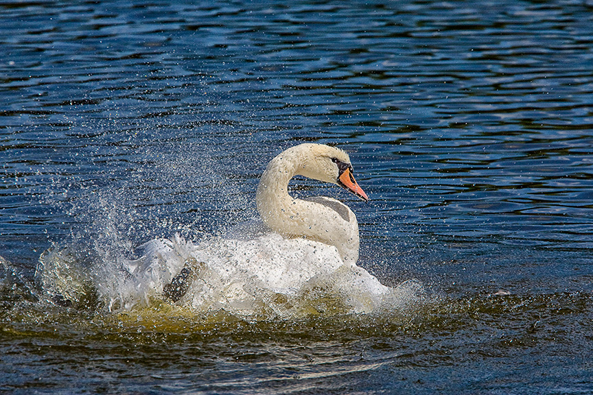 Splashing Mute Swan. Canon EOS 1D MkIII, Canon 400mm f/4 ID DO lens, Canon 1.4X Teleconverter, f/11 @ 1/2000 sec to stop action, -1 stop exposure compensation because of white Swan in Bright sunlight, ISO 400. Same exposure for all images. These are just a few out the 100 images or so in a 4 minute time frame.