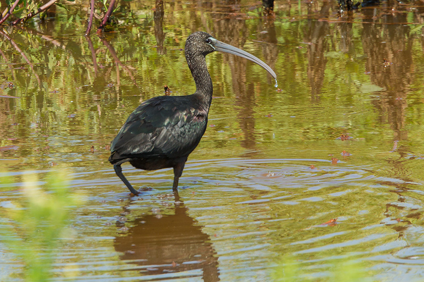 I saw some Glossy Ibises feeding in the water to the right of the Heron & Egret Trees. There were a lot of tall grasses in the way, so I tried shooting through a few small openings in the grasses. There was a lot of strong contrasty light on them which helped on the dark colored birds.