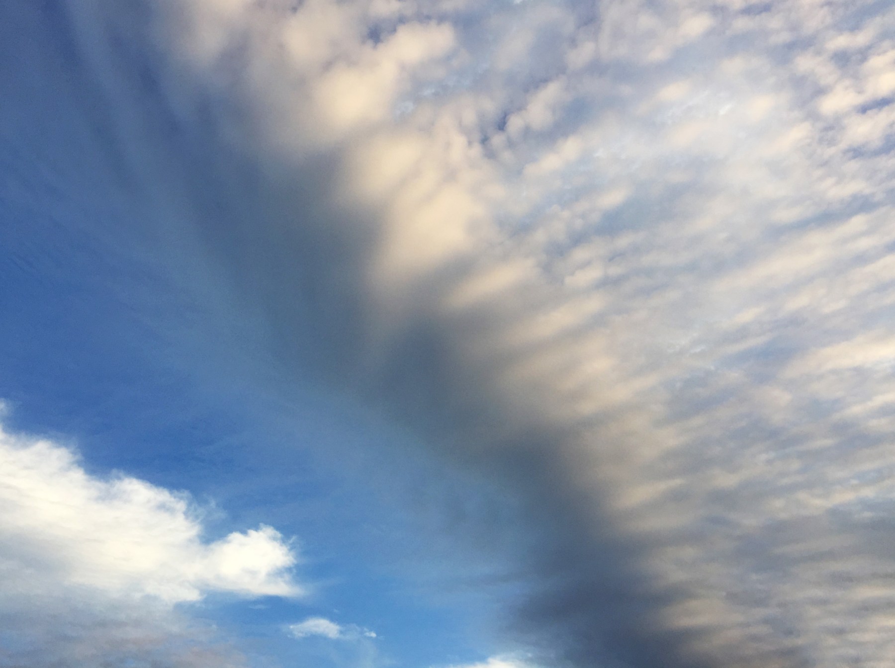 When I was leaving work, I liked the clouds in the sky. I only had my iPhone, so I shot a burst of 8 images. My iPhone seems to have quite a bit of noise, so I loaded them in Photoshop, put them in a layered file & converted them to a Smart Object layered stack. Then used Stack Mode > Median to lower the noise level. Helps make my iPhone images more usable and lowers the noise a lot.