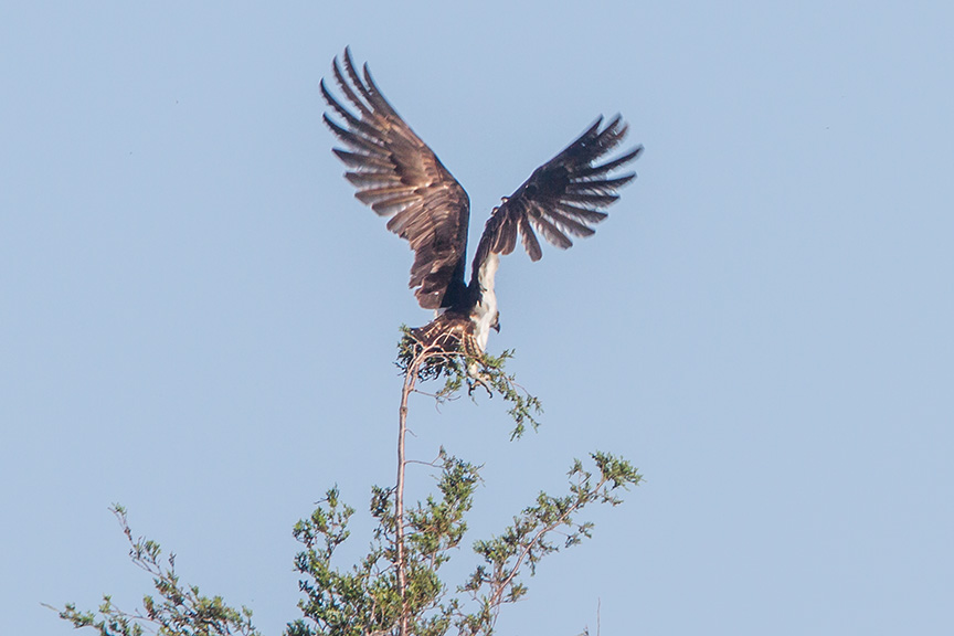 I saw this Osprey landing in a treetop across a small pond (Gull Pond) at the Edwin B. Forsythe National wildlife Refuge, Brigantine division in Oceanville NJ. I was watching, seeing what would happen. Hoping it would take off and fly towards me. All of a sudden it raised it’s wings and took off going away from me to the right. It is interesting to see the wing positions.