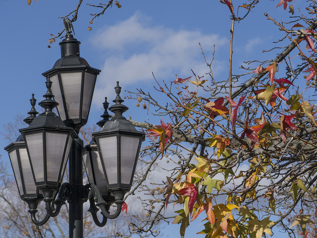 The community we live in now have beautiful tree lined streets. Many of them are American Sweetgum trees. In the Fall, it is amazing the different colors of leaves in the same trees. The leaves are 5 pointed star shaped and in the same tree many different sizes, from small to large. They also have a hard multi-spiked fruit that looks like a spiked ball. These are from late fall so the leaves were getting scarce in the trees. Work sometimes gets in my way for posting here.