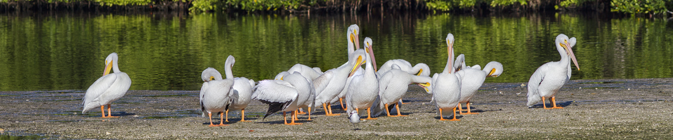 Another Group of American White Pelicans photographed along the Wildlife Drive at the J.N. Ding Darling NWR in Sanibel Florida. This was a 5 image panorama, handheld, shot with a 300mm f/4 lens, with a 1.4X teleconverter. When doing a pano like this, do not use auto exposure, especially with white subjects, because the exposures can vary, giving you different exposures which are harder to blend together. You then have to try to balance all the exposures before assembling the pano. Most people use a tripod for doing Panos, but I tend to do more handheld. The Pelicans are still moving, even slightly, so I still have to go in to the layered Photoshop file and erase some of the moving overlaps before the final “blending. The auto features usually works fairly well for the final “flattening” of the layers in your file. The hardest part is choosing which “mode” of auto align to use in Photoshop for the initial lining up of the layers. You might have to try a few of the choices and see which one works best for your subjects. It has a lot to do on the angle you are to your subject and also the focal length of the lens you are using. In Photoshop, under EDIT, go to auto-align. Then you have a few choices. It is a trial and error to see which method works best for your image. Auto align usually works fairly well, but sometimes “Cylindrical” works well for what I shoot also. It really depends on the focal length of the lens you are using and the angle you are to your subjects. Then go to Auto Blend to “blend” them together. The other choice here is “Stack” which is used for combing a set of images you shot for more depth of field, for a sharper image across a wider area, in simple terms. Under Auto Blend also check on the Box – content aware fill transparent areas of your merged files. This fills in empty areas with what Photoshop thinks is missing, and works fairly well. This happens more with wider angle lenses because of the changing angle of horizons, skies and foregrounds have different perspectives as you are shooting from left to right. This comes in handy especially if you are hand holding your camera or shooting with a wide angle lens. Also Once you flatten your image, I sometimes crop from the top and bottom to make a better “composed” image. Sometimes shooting panos, you are shooting “Taller or Wider” than you want your final image. So cropping in helps the composition. The above is just a simple overview of shooting panoramas, you can find lots of info online.