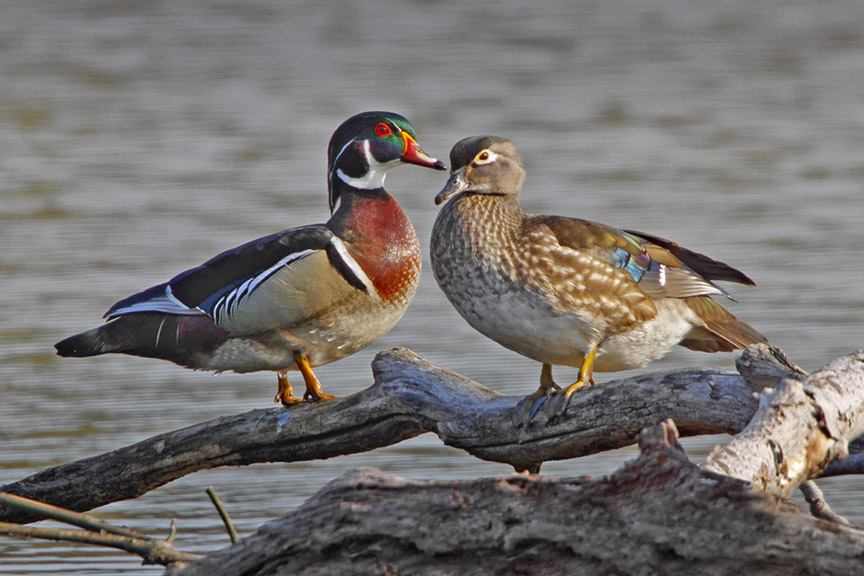 I saw this pair of Wood Ducks at a local park. Usually Wood Ducks are swimming around the lake or on the shore. So it was different to see them balancing on these branches that were in the water. They are definitely colorful ducks!