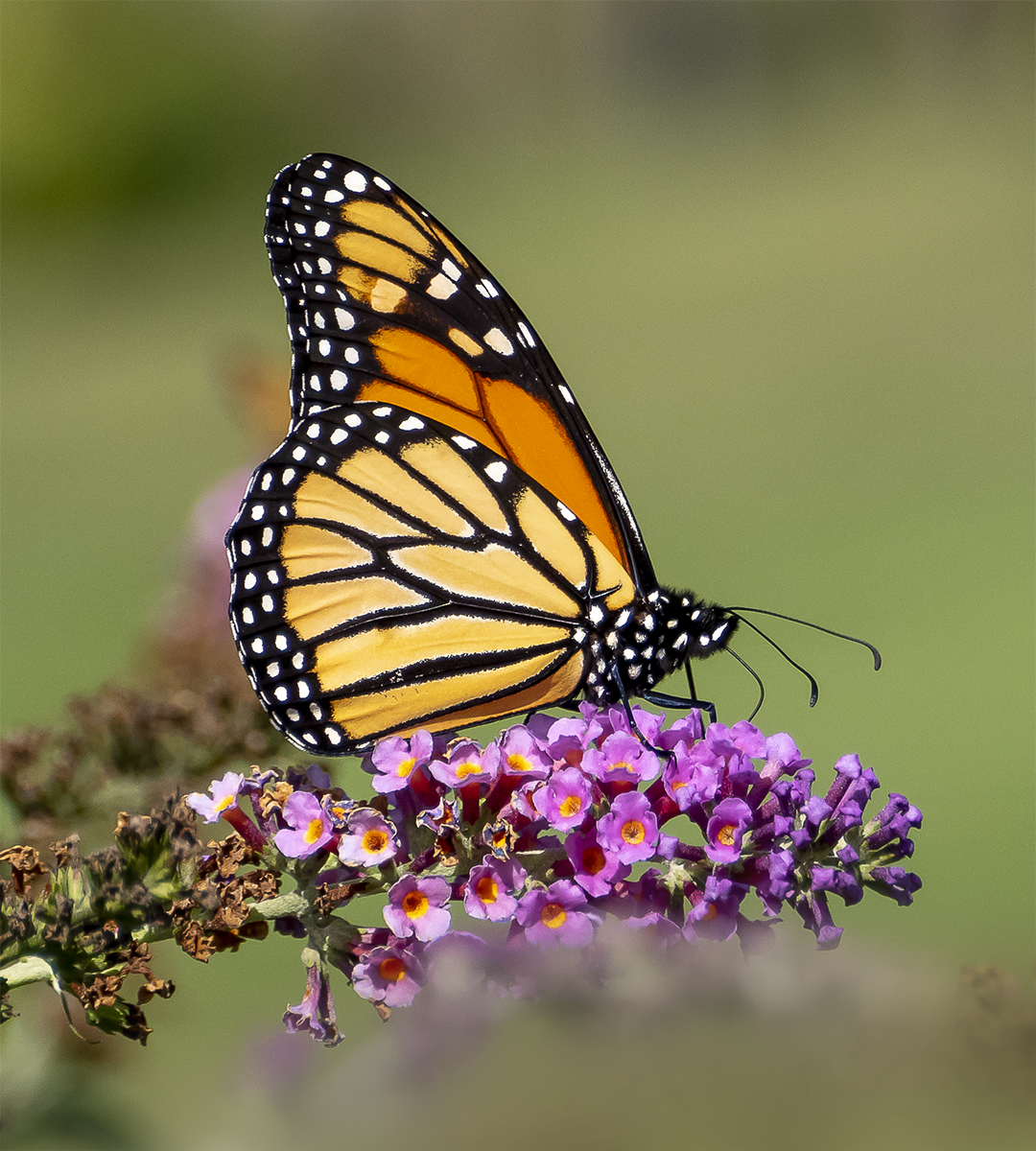 A series of Monarch Butterfly images taken last weekend at Davidsons Mill Pond Park in NJ. We were surprised there were so many still around. These were probably recently released from their Butterfly Hut Exhibit at the Park. All are taken with an m43 Olympus camera with a Panasonic 14-140mm zoom @ 140mm. (Full Frame Digital Equivalent (FOV) of 280mm). I was testing techniques to get smooth backgrounds and still retain sharpness on the subjects. So I was shooting wide open @ f/4. But with m43 cameras the images seem to be a little “Coarser” then larger formats. So I then “Softened” the backgrounds in a different layer in Photoshop, above the main image and using opacity, letting the original layer show through somewhat to get original details, but “Softer” backgrounds.Β  Most of these are busy feeding on the nectar from the plants near the exhibit.