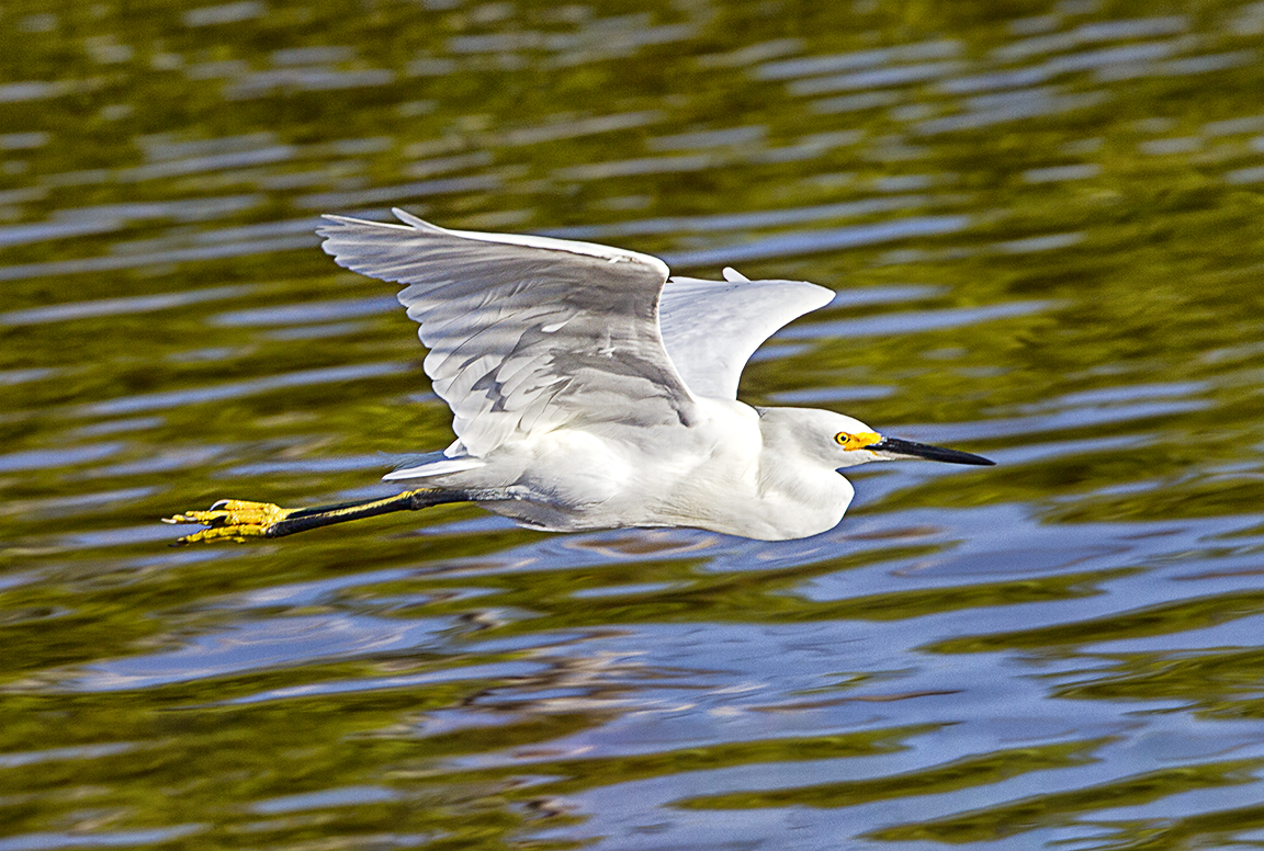 This image of a Snowy Egret is from a previous trip to Florida. I liked the wings in a raised position as it glided by me and the highlight reflections of the sky in the water. Also the Snowy was low enough to get reflections of the highlights & shadows of the water under the wing. Image taken with a 400mm DO lens.