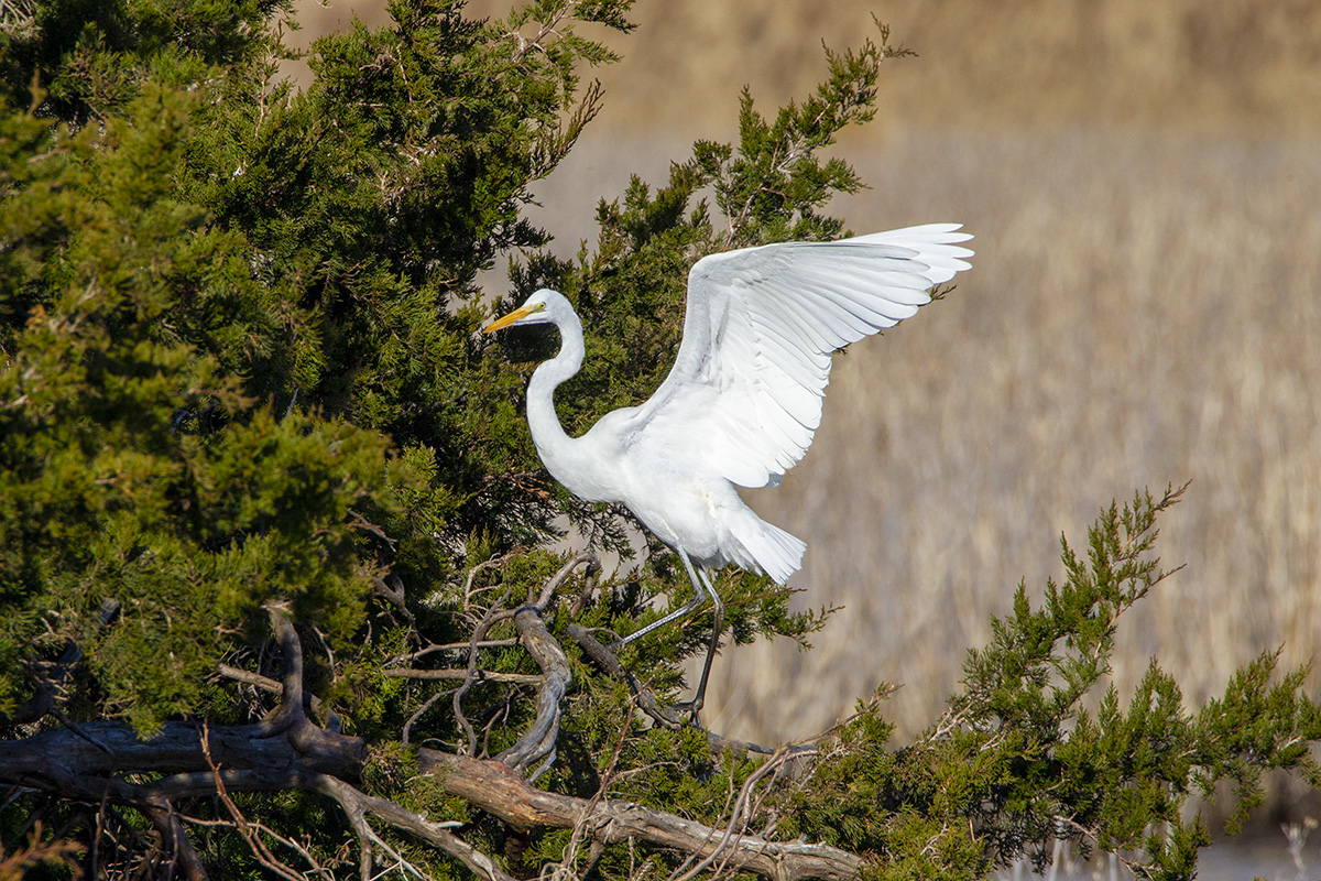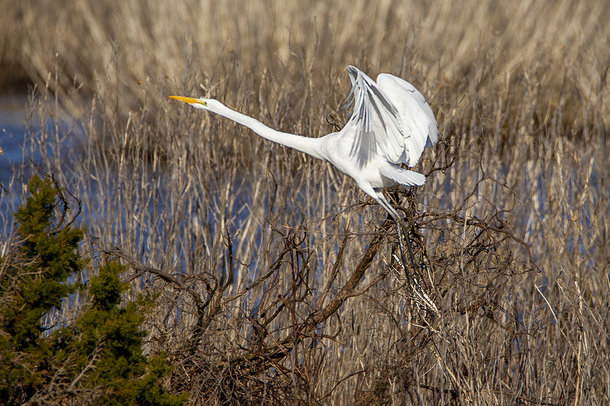 On our visit to the Brigantine Division of the Edwin B. Forsythe National Wildlife Refuge we saw quite a few Great Egrets around the Refuge. This one was foraging in the grasses along the Wildlife Drive and flew into a group of trees along a turn on the Wildlife Drive. It was usually a great spot for photographing Night Herons.It stayed in the tree for quite a while just moving around on the branches. All images were taken with a Canon 1DmkIV with a 150-600mm Tamron lens @ 600mm.