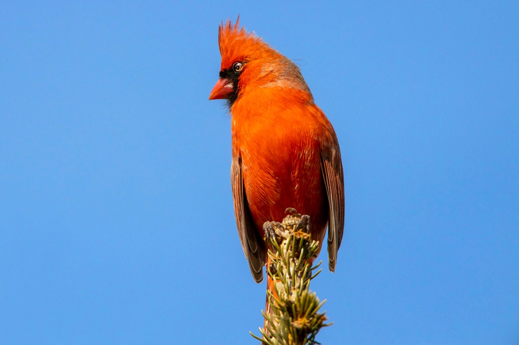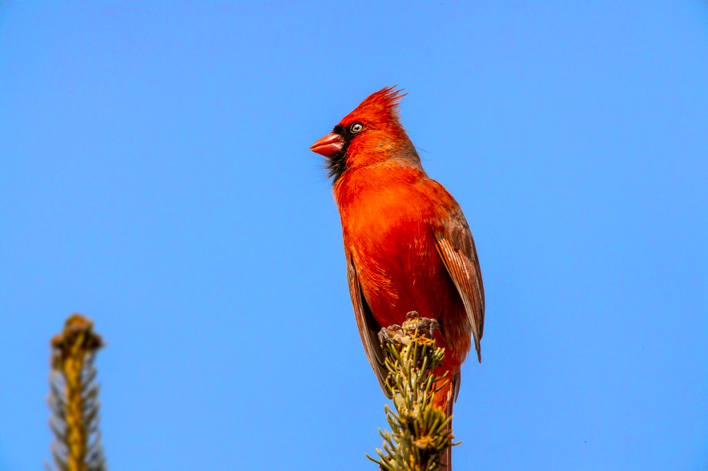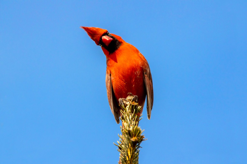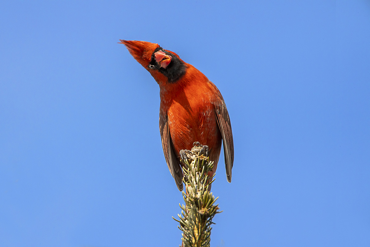 For a while now we have been enjoying the visiting birds on the top of our neighbors tree across from our front door. Today it was a very colorful male Northern Cardinal. So I shot a series of images using a Tamron 150-600mm lens with a Sigma 2X teleconverter on a Canon R. This gave me a final focal length of 1200mm so I upped my ISO since I was handholding the camera. The Canon R autofocused fine with this combination. Images were taken @ 1/500 sec, f/11, 1000 ISO. As I was photographing him, he kept an eye on me in the first few minutes. After a while he just kept looking to the left & right.