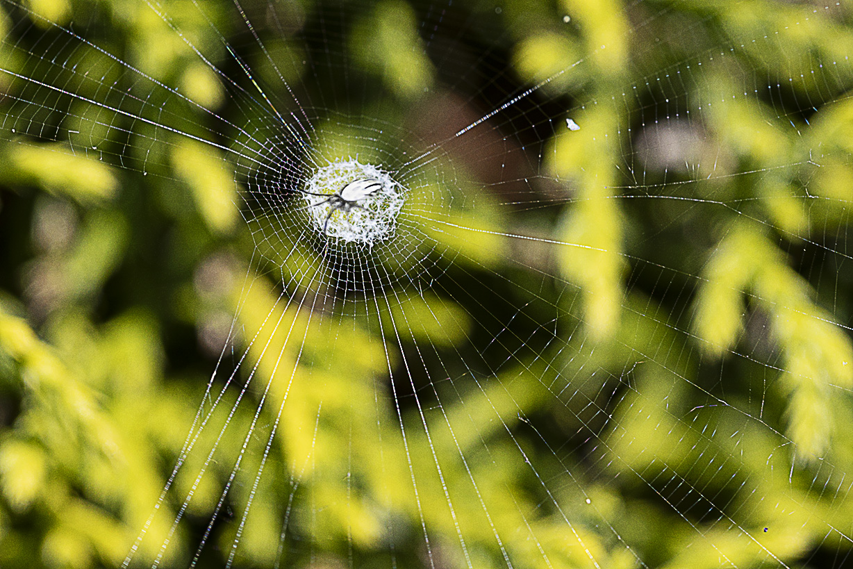 I was looking for bugs or dragonflies in our garden and noticed this tiny spider in the middle of a very large web. The spider was only about 1/4 inch long so it was interesting it had such a large web. I shot a few images with my iPhone then went in to get my 150mm Macro with a Canon 1.4x Teleconverter. I should have also shot a wider shot showing the whole web. I did not confirm the type of spider but think it is an Orchard Orb-weaver.