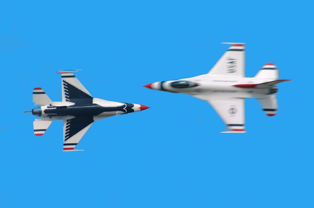 The Thunderbirds Opposing Pass is a high-risk, high pass meer feet apart, showcasing extreme pilot trust, precision, and aircraft control for a dramatic visual effect. The pilots maintain near-vertical flight, one slightly offset, creating the illusion of nearly touching at show center, requiring split-second timing and coordination. The Thunderbirds opposing pass, specifically the Opposing Knife-Edge Pass is a high-risk, high reward where two solo F-16s approached head-on, roll on their sides (knife-edge), and pass mere feet apart at over 1,000 mph combined closure, showcasing extreme pilot trust, precision, and aircraft control for a dramatic visual effect. The pilots maintain near-vertical flight, one slightly offset, creating the illusion of nearly touching at show center, requiring split-second timing and coordination.