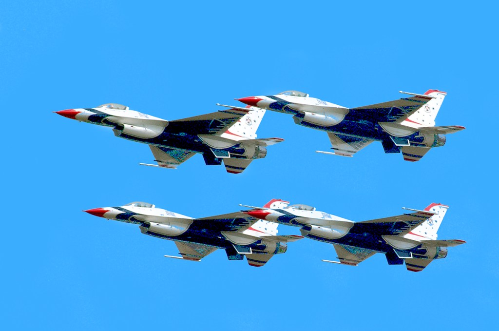 Here is the third in a series of images of the USAF Thunderbirds Demonstration Team. The demonstrations are a mix of six aircraft performing formation flying and solo routines. This four-ship Diamond Formation showcases the precision and training of U.S. Air Force pilots, as well as the agile maneuverability of the F-16.