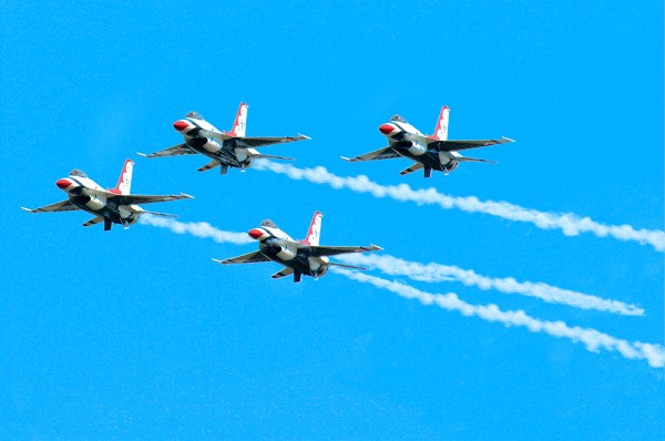 Here is the fourth in a series of images of the USAF Thunderbirds Demonstration Team. The demonstrations are a mix of six aircraft performing formation flying and solo routines. This four-ship Diamond Formation showcases the precision and training of U.S. Air Force pilots, as well as the agile maneuverability of the F-16.