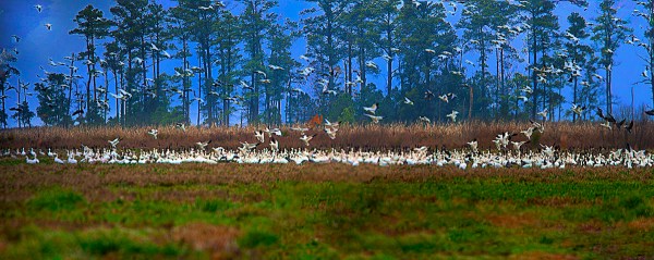 Blackwater NWR is one of my favorite places to photograph birds, landscapes & Bald Eagles. For this post I am showing a 15 image panorama of a large group of Snow Geese along the Wildlife Drive. I shot a series handheld going from left to right to get all the Snow Geese in the image. I was using a Canon 1D mkIII with a 400mm DO lens with a 1.4x teleconverter. I was using f/8, 1/400 sec, ISO 400.