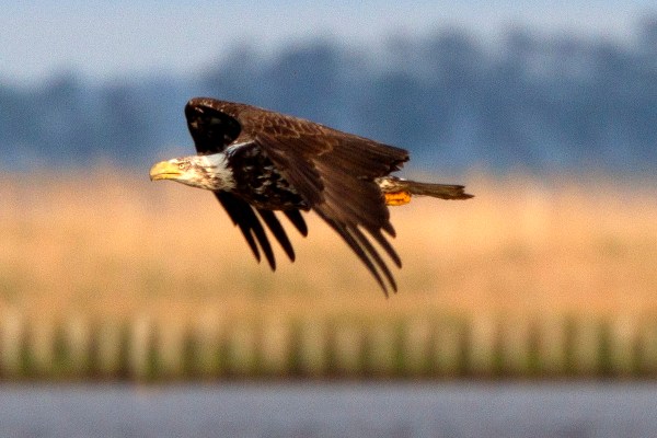 For this Post I am showing a some-what close Eagle fly-by. Usually my Bald Eagle images are looking up to the Bald Eagles flying in the sky or sitting on a high tree branch. This post shows a Bald Eagle that was flying very low to the ground as it was flying by me. I was using a Canon 7D camera with a 400mm DO lens with a 1.4x teleconverter. The distance to the Eagle was 161 meters.