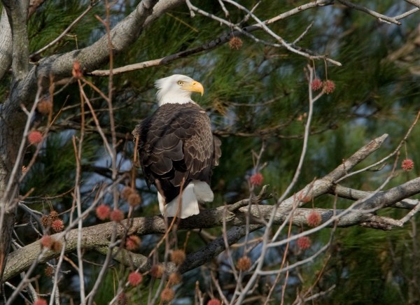 Here I am posting 2 images of a Bald Eagle that was some what hiding in the high branches. We were walking along the path when we saw the Eagle in the distance. We did not want to scare the Eagle off so I just took two images and we went back the other way. I was using a Canon 1D mk III with a @ 400mm DO lens with a 1.4X Teleconverter. The Canon 1D had a cropped sensor so with the camera’s crop of 1.3x and the 1.4X I had a focal length of 728mm.