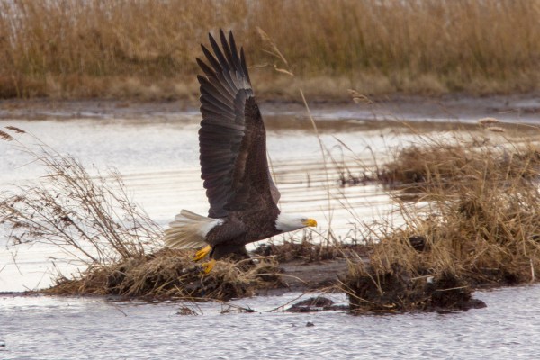 I saw this Bald Eagle flying very low in the distance. Then it turned and flew along where we were setup. So I got a few good images as it flew by us. I was using a Canon 1D MK IV with a Canon 400mm DO Lens & 1.4 Teleconverter. The Canon 1D mkIV has a 1.3x cropped sensor. So adding all this it was giving me a 728mm view.