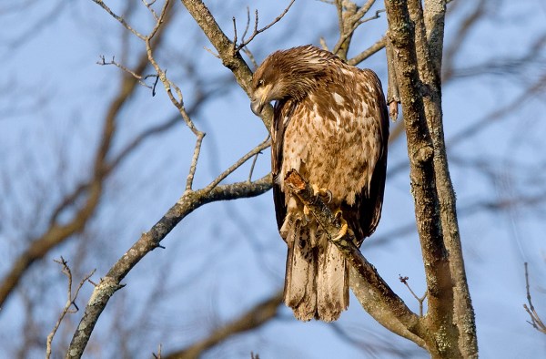 I saw this Immature BALD Eagle in the tree tops as I was walking in the woods. I had a Canon 1D mkIII with a Canon 400mm DO Lens. My settings were f/5.0, 1/1600 second & ISO 640.