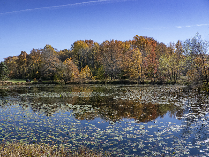 Still working on images from our walks at the Davidson’s Mill Pond Park. I liked the colors in the water with the Fall colored subdued trees behind the pond. The featured image was shot @ 14mm on a m43 format camera. The blue sky seemed to really reflect in the pond water setting off the floating fallen leaves. Then I tried 2 additional shots, one @ 41mm and then one @ 32mm. I liked the wider view “featured” image best of the 3. But sometimes you don’t know until you compare them all at once and then you can see which you like best.