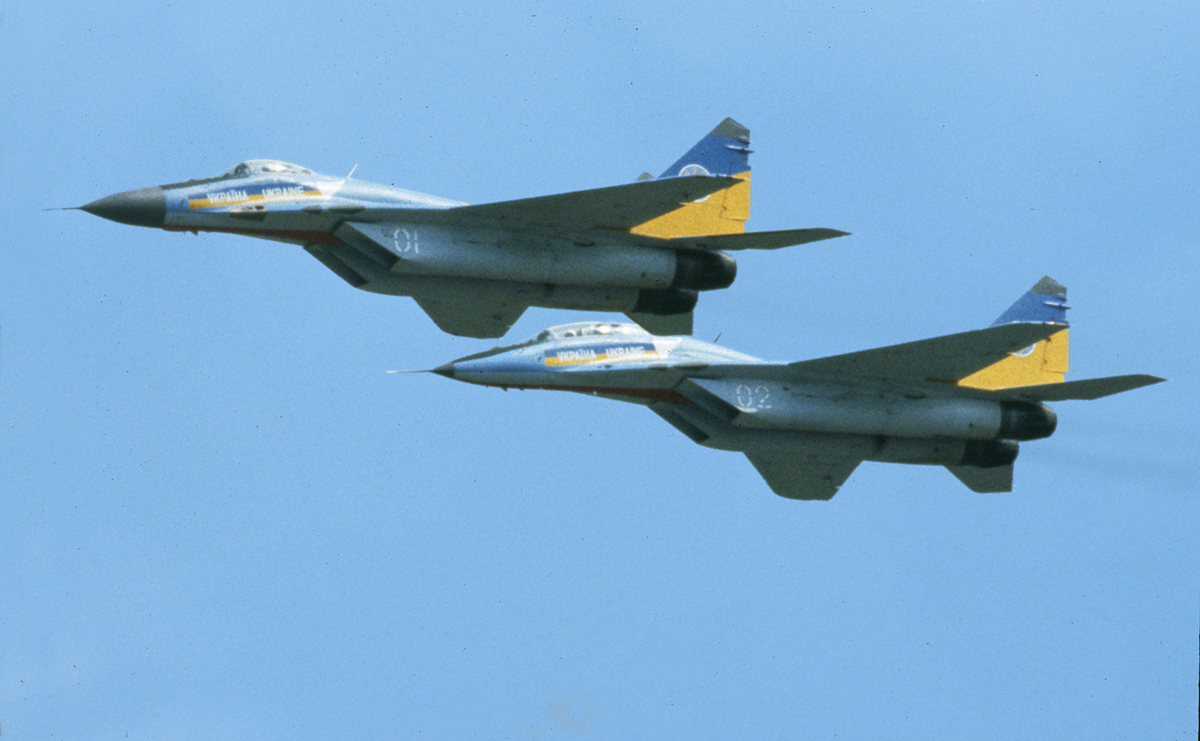 I used to do a lot of Aviation Photography back in the day before I transitioned to Landscapes & Birds. In May 1992, two Ukrainian Air Force MiG-29 fighters departed for North America to participate in the 100th anniversary celebration of Ukrainian immigration to America. Russamerica Airshow Incorporated sponsored the tour and the aircraft, one MIG-29A (Single-Seater) and one MiG-29UB (2 Seater) , were transferred in a disassembled condition onboard an Antonov An-124 cargo plane to Canada. On May 8, the aircraft arrived at Namao Air Base, in Edmonton, Canada and were reassembled in a record time of just two days. On May 16, they flew for the first time at the same air base. Then they went on tour through the US at various Air Shows. The images here were taken at one of the Airshows I usually photographed each year. Back then these were taken on Canon F1N film cameras with Kodak Ektachome 200 slide film & then scanned for Digital Files. This was a few years before my studio transitioned to Digital Cameras. I was used to photographing the US Thunderbirds & Blue Angels Demonstration Teams & the Canadian Snowbirds which usually would do group Fly Bys and some other displays for the show. Then regroup and fly by again sometimes towards each other and Pull-up and Climb straight up. The Ukrainian Air Force MiG-29’s show was unlike the shows I usually saw. They were almost always in view on the main airshow area and would flyby show center, then climb, rotate and go back the other way. So it was fun to watch and see different flight maneuvers and displays of the Ukrainian Team.