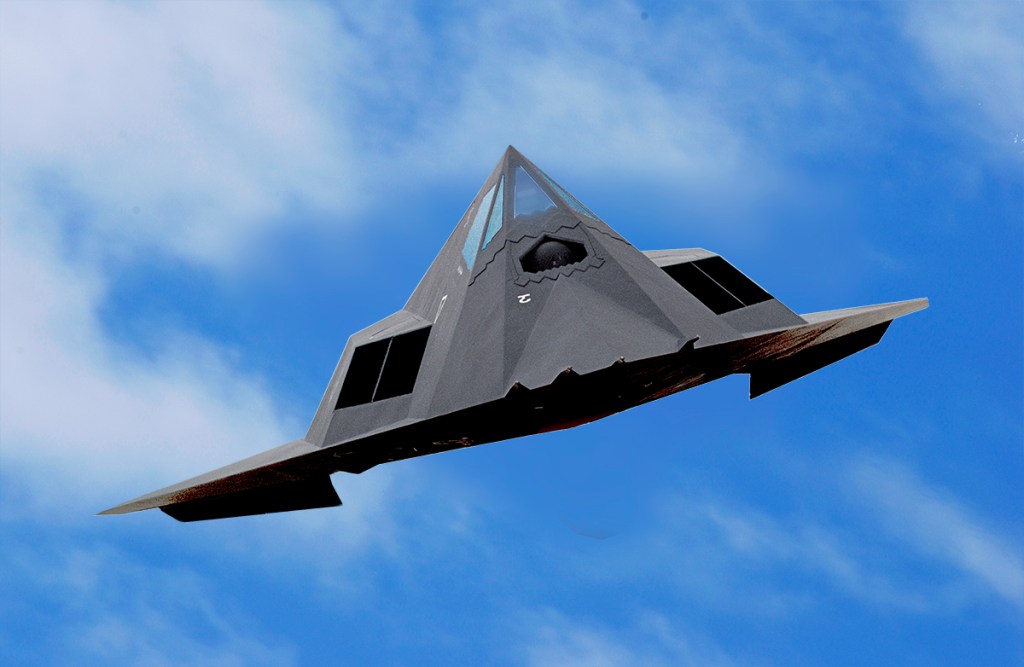 F117 Stealth Fighter Flying out in the setting sun