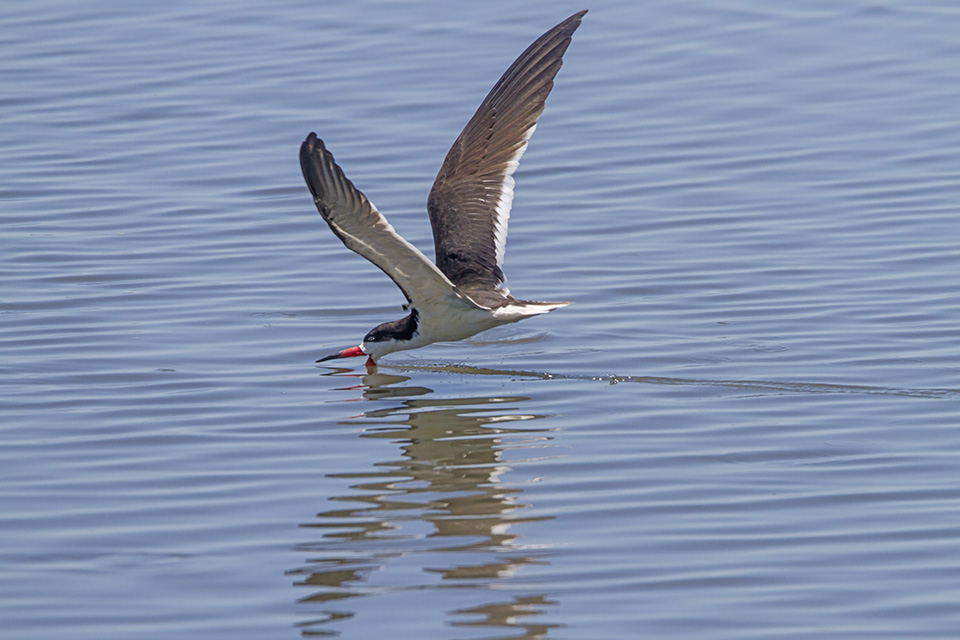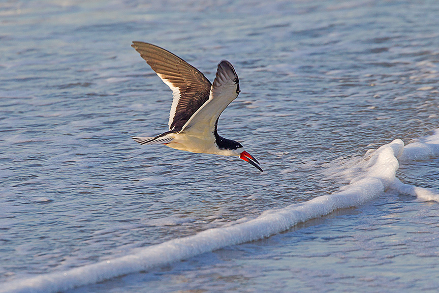 Black Skimmer Flying By, Turning, Cutting the Water with Tip of Beak. Canon EOS1 MkIV, Canon 400mm f/4 DO lens, Canon Series III 1.4X Teleconverter, f/6.3, 1/500 sec, +0.33 exposure compensation, ISO 400