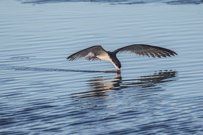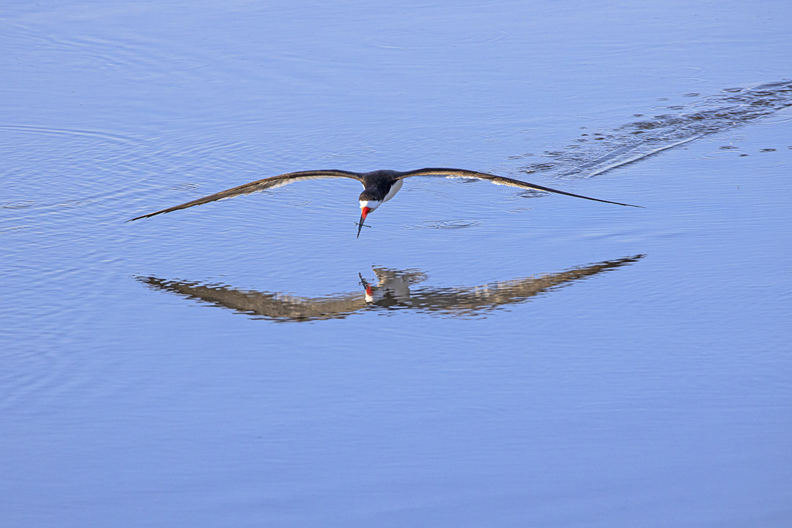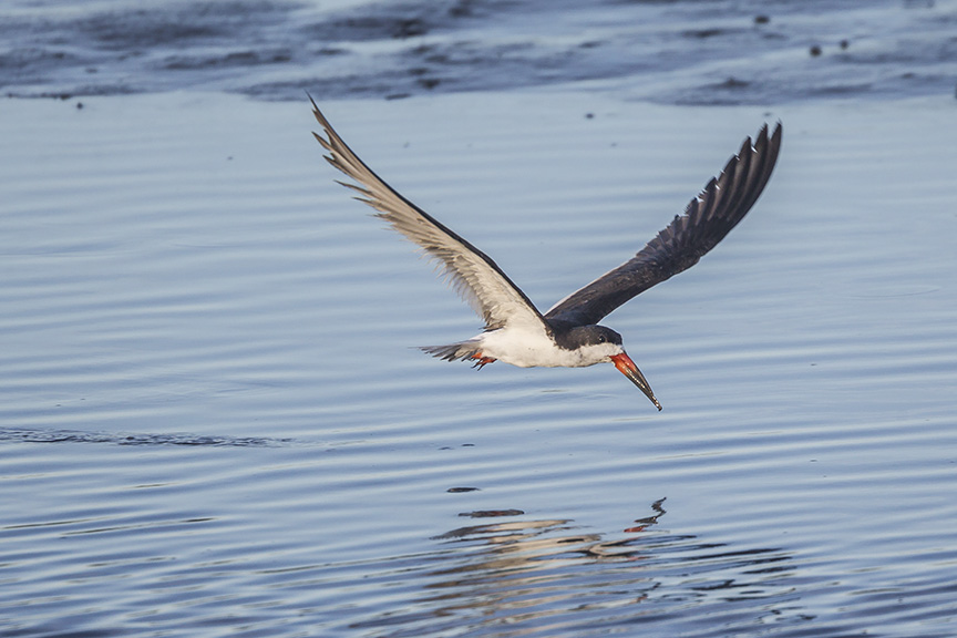 This shot is a good example showing how Skimmers feed. Gliding along the surface of the water. When they get something their head & beak tilt down. It is fun to watch a few working an area. Going back and forth, giving you lots of photo opportunities.