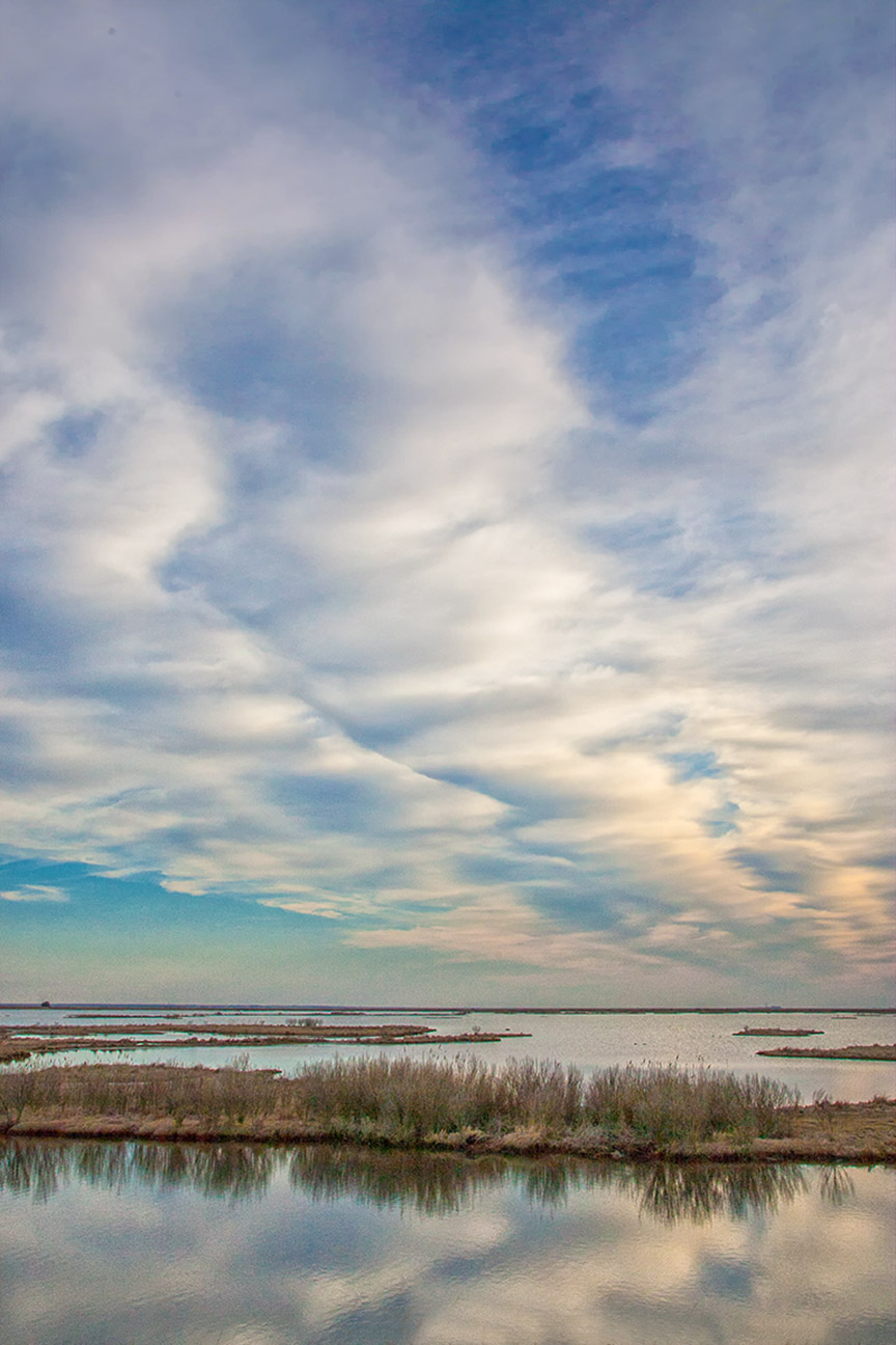 When we were at the Edwin B Forsyth NWR, Brigantine Division, we were looking for birds along the Wildlife Drive. But I liked the tranquil look of the soft clouds reflecting in the water. So I shot a series of shots combining them in Photoshop.