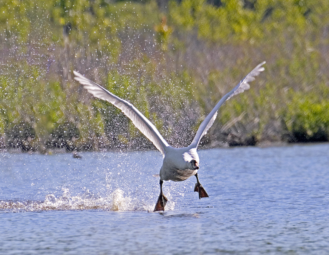 Swans seem to need a lot of space to take off! Plus the sound of the takeoff is impressive. Their feet slapping on the water and their wings flapping make quite an interesting sound for an interesting takeoff to photograph.