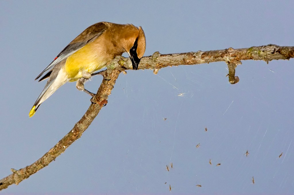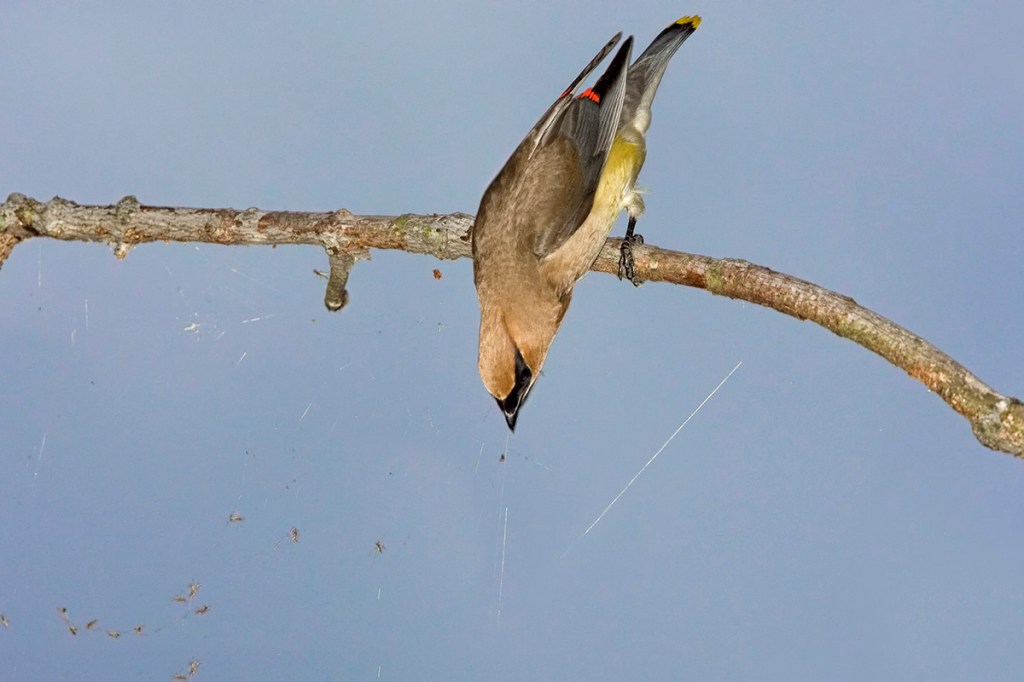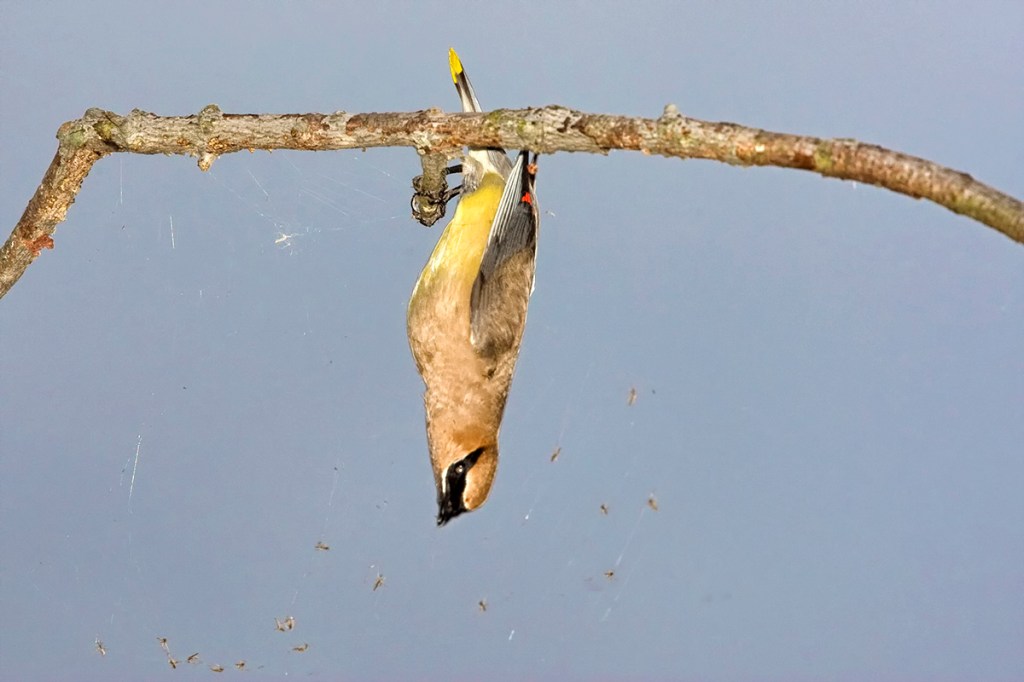 I was cleaning up old backup hard drives and found this series of images of a Cedar Waxwing dining on insects caught in a web under a branch. This was many, many years ago early in the morning. I was using a Canon 1D mkIII with a 400mm Canon DO lens and a flash with a Better Beamer Flash Extender to fill in the dark areas. I was on an observation platform and the Cedar Waxwing was almost level with me as I was photographing the waxwing. It is amazing how much better our digital cameras are now compared to the early days!