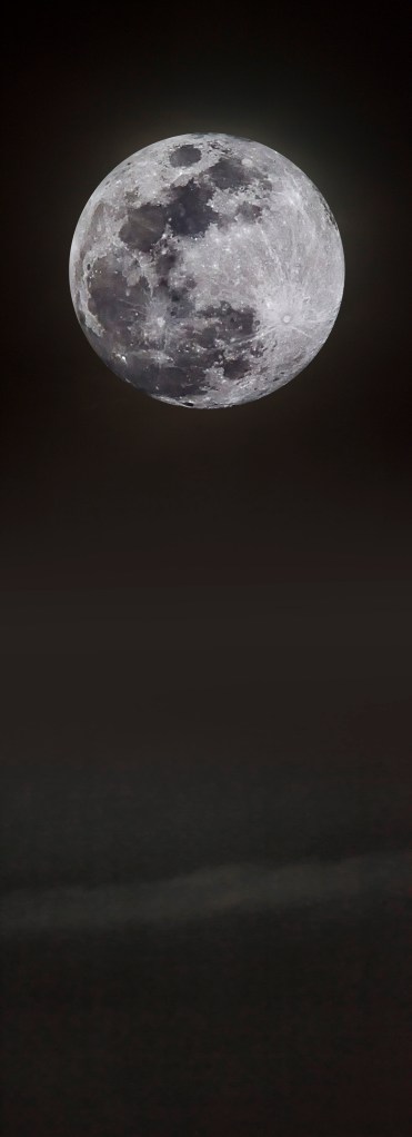 3 image vertical panorama showing Blue Moon with cloud formation below the moon. To expose for the cloud below the moon would just be a white blown out circle. I just brought up the brightness a little so the clouds below the moon were somewhat visible.