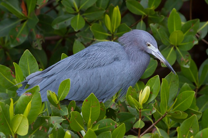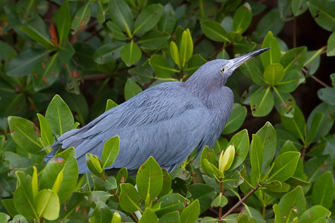 Here are some more photos of the Little Blue Heron from a previous post. It was early in the morning with not many subjects to photograph. I came upon this Little Blue along the Wildlife Drive. It was working it’s way through the bushes, above the water. The trees were blocking the sun, so it was fairly dark, so I shot a series of bursts hoping to get a sharper image in one of them. Being in the shade, I was shooting at 1/50 sec at ISO 800, handheld. I do not like raising the ISO on this camera above that, so I got what I could.