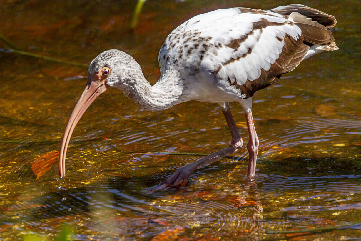 There are lots of photo opportunities along the Wildlife Drive at the J.N. Ding Darling National Wildlife Refuge. I was photographing this Immature White Ibis in one of the water channels along the Drive. It was foraging for a meal and had success multiple times.