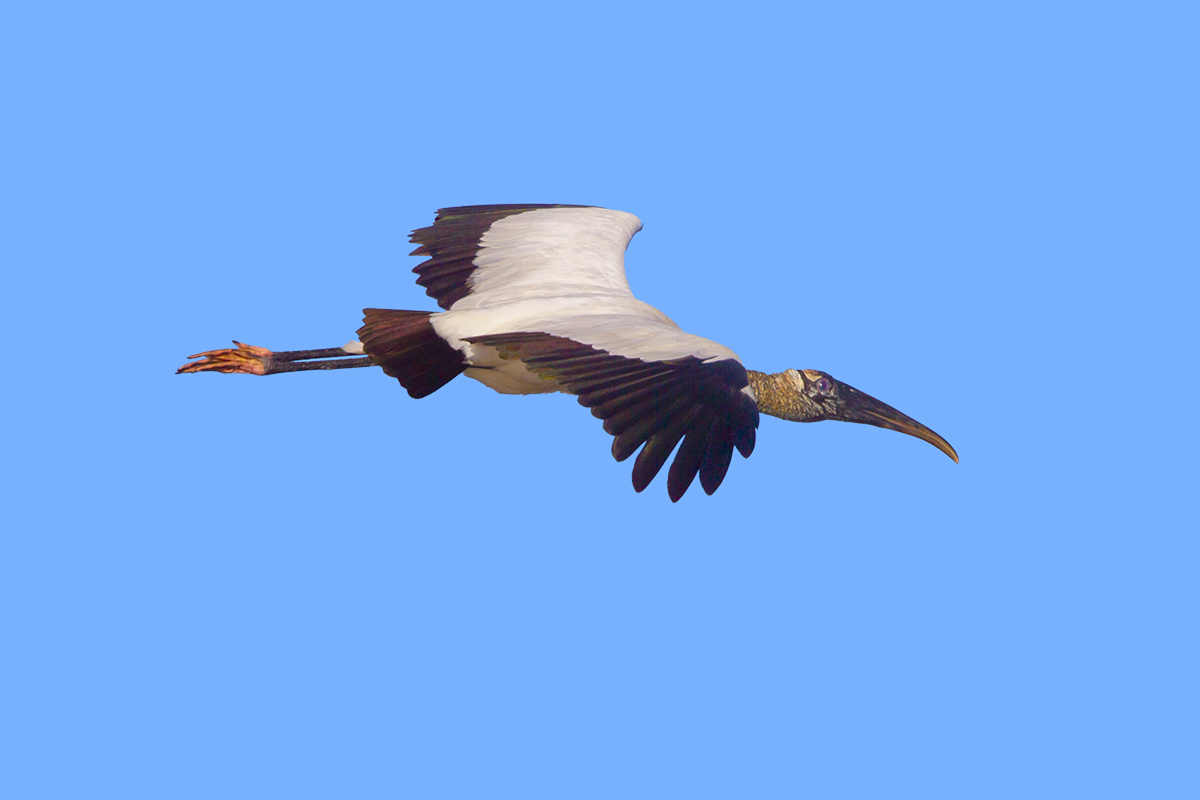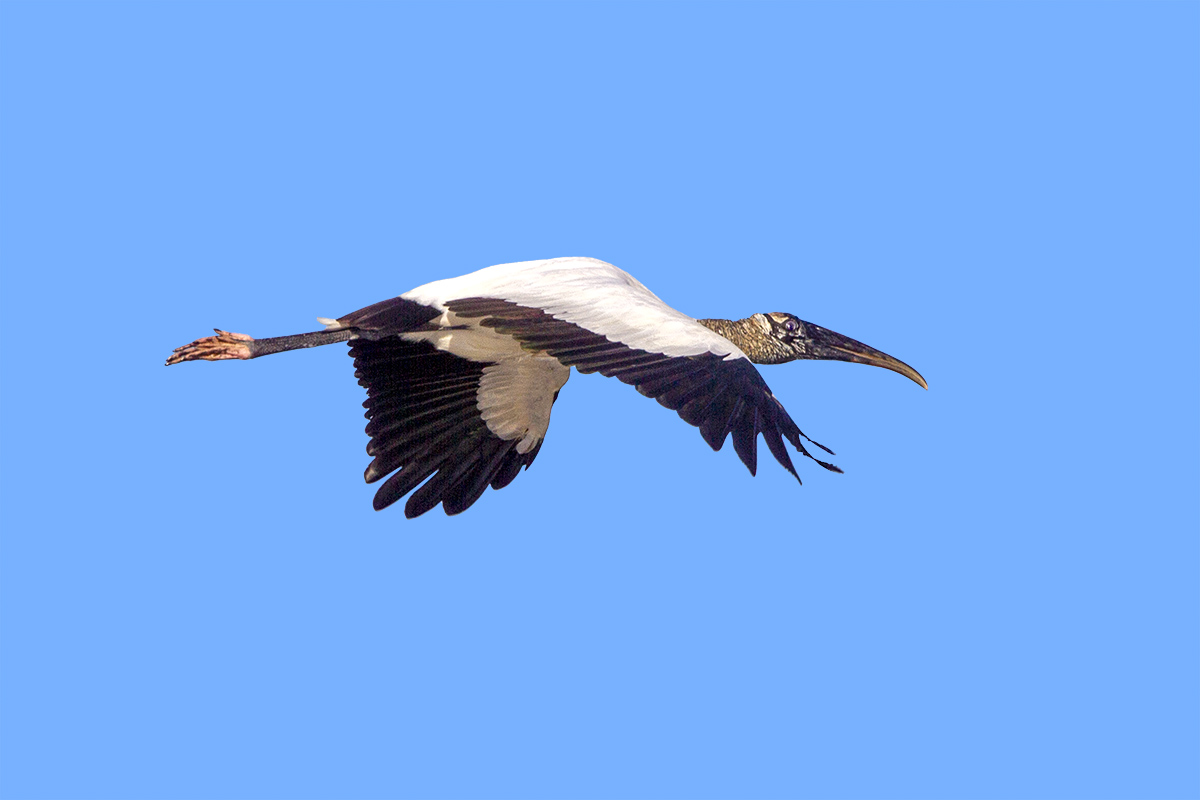 A Wood Stork fairly close Fly-By along the Wildlife Drive at J.N. Ding Darling National Wildlife Refuge in Sanibel Florida. Images here were taken years ago with a Canon 400mm DO lens with a Canon 7D and a 300-800mm Sigma lens with a 1.4x Teleconverter on a Canon 1DmkIII. The Wood Stork is a large American wading bird in the family Ciconiidae (storks), the only member of the family to breed in North America. It was formerly called the “Wood Ibis”, though it is not an Ibis. The Wood Stork is 59.1-68.9 inches tall so it stands out among other birds when roosting among other birds . They fly with their neck and legs outstretched but tend to perch with the neck drawn in, giving them a hump backed appearance. Wood Storks are entirely white save for their black flight feathers and tail. Their head is not feathered and has a scaly bald look.