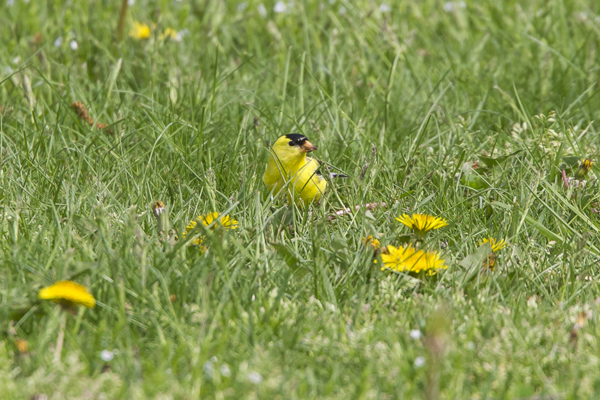 I was trying to get images of the Goldfinches that were zipping around where I was setup. They just never got close for any good images. As I was packing up this one landed a little closer, but still fairly far away. Sometimes you just have to shoot what you can get. I liked the bright yellow Goldfinch in the green grasses with the pop of Yellow color from the Dandelions. So I just got a few shots before it flew away.