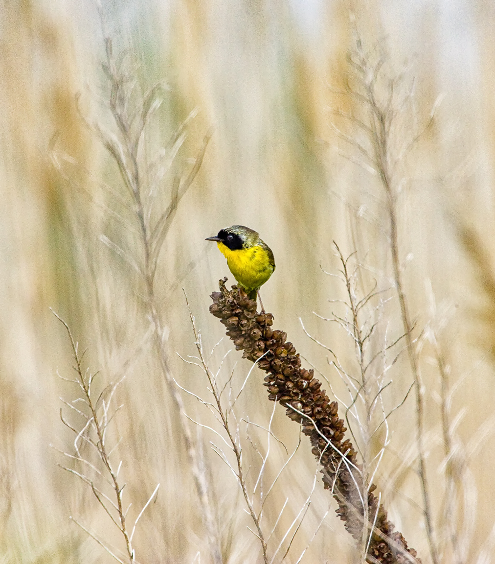 I liked how this Common Yellowthroat warbler stood out in this field of dried brush. I also liked the angle of the brush in the background and the bird’s perch leaning in the same direction. Usually they are flitting from perch to perch, but this one stayed for a while before flying off giving me a chance to get a few shots. Image taken @ 800mm (Canon 400mm f/4 DO lens with Canon 2X teleconverter)