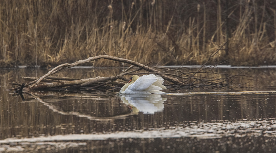 I was following, with my camera, this Mute Swan as it was swimming around the lake. It was in a “displaying” posture which is usually when a mate is nearby or a rival male is near, before it chases it away. I saw neither of those two choices. It just kept swimming around the small lake.