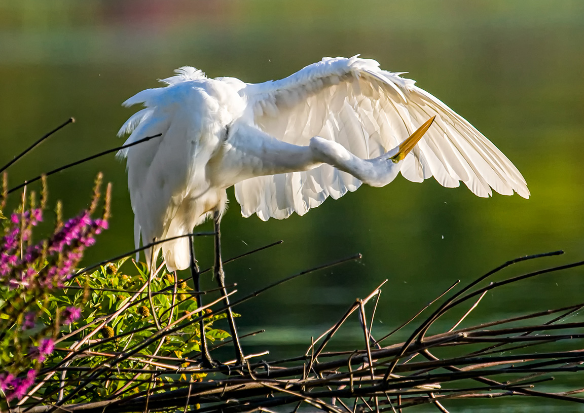 I was photographed this Great Egret at a local park years ago. It started to preen it’s wing and I liked the early morning sun lighting the wing. Image shot with a Canon 400mm Canon DO lens with a 1.4x Teleconverter.