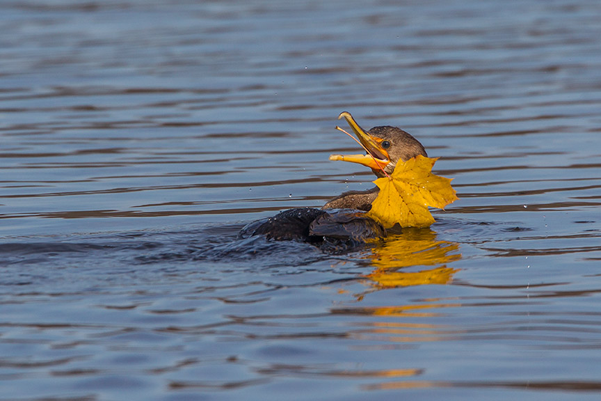 I was at the Celery Farm this morning and a Cormorant was working the area for a meal. He kept diving and then coming up with nothing. He was fairly far out when he dove down to try again. Right after he dove a Gull landed nearby. When he surfaced with a large fish, it was right under the Gull. The startled Cormorant dropped his fish and then went after the gull. It happened so quickly I did not get a sharp shot. Then both went on their separate ways. The cormorant came closer as he was diving and fishing. Closeup, he surfaced with his new meal. Unfortunately it was a leaf.
