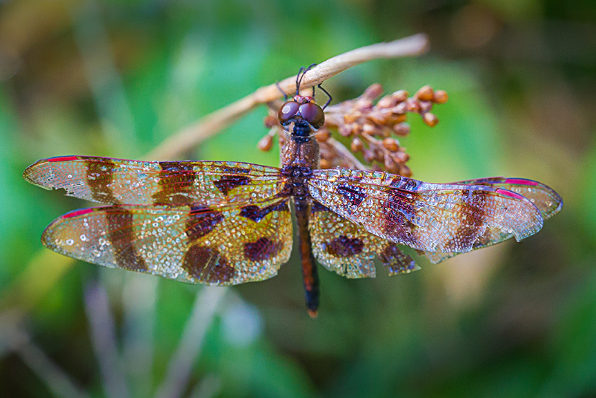 We went to Davidsons Mill Pond Park to look for dragonflies and what ever else we could find. I have looked for dragonflies early in the morning covered with dew for years, but have not found any so far. To our surprise we found one on this morning. Unfortunately it was very windy plus in the shade. It was not warm enough for the Halloween Pennant to fly, so we had a great photo subject that was not going anywhere for a while. Being in the shade the light was terrible and with the wind it was blowing back and forth. I had to raise the ISO to 2000 and still only had a shutter speed of 1/125th sec @ f/8 with a 150mm Sigma macro. Hand holding the camera, I tried shooting quite a few series of different focus points to combine later in a stacked photoshop file with sharpest ones to combine for one sharp image. I shot quite a few bursts as it was blowing around. Being late in the season this dragonfly showed a lot of wear, damaged wings, pieces missing, etc. The one wing was even bent at an odd angle so I left that section with a little softer focus. With the way the wind was blowing I was surprised I got as much as I did. Not perfect but it was still fun to try.