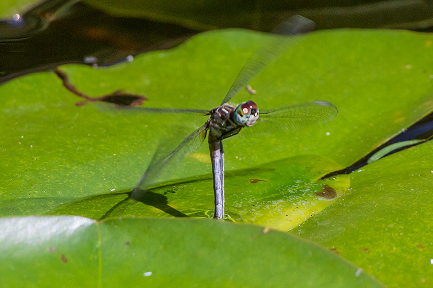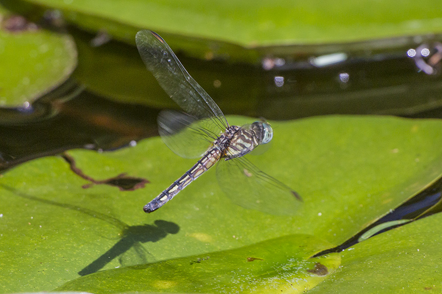 Female Blue Dasher Moving Around, Laying Eggs in Water. Canon EOS 1D MkIV, Canon 400mm DO IS f/4, 32mm of extension tubes, Canon Series III 1.4X Teleconverter, 25mm extension tubes, Fill flash, with Better Beamer Flash Extender, – 2 stops, f/8, 1/1000 sec., -2 stops, ISO 1250