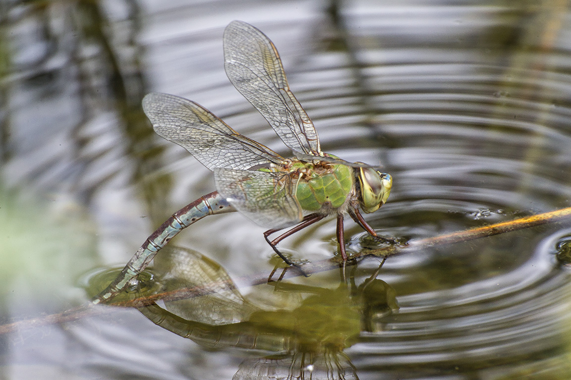 I was photographing this female Green Darner dragonfly that was busy laying eggs in a small pond. It spent a large amount of time doing this so I had plenty of time to photograph the activity. It covered a very large area in this fairly small pond. The featured image is a 2 image panorama to get the reflection of the Darner in the image also. The Darner seemed to be spreading the eggs in a very wide area around the small pond. I was using a Canon 400mm DO lens & some images were shot with an extension tube to focus this close on the female Darner dragonfly when it came too close for my minimum focus distance.