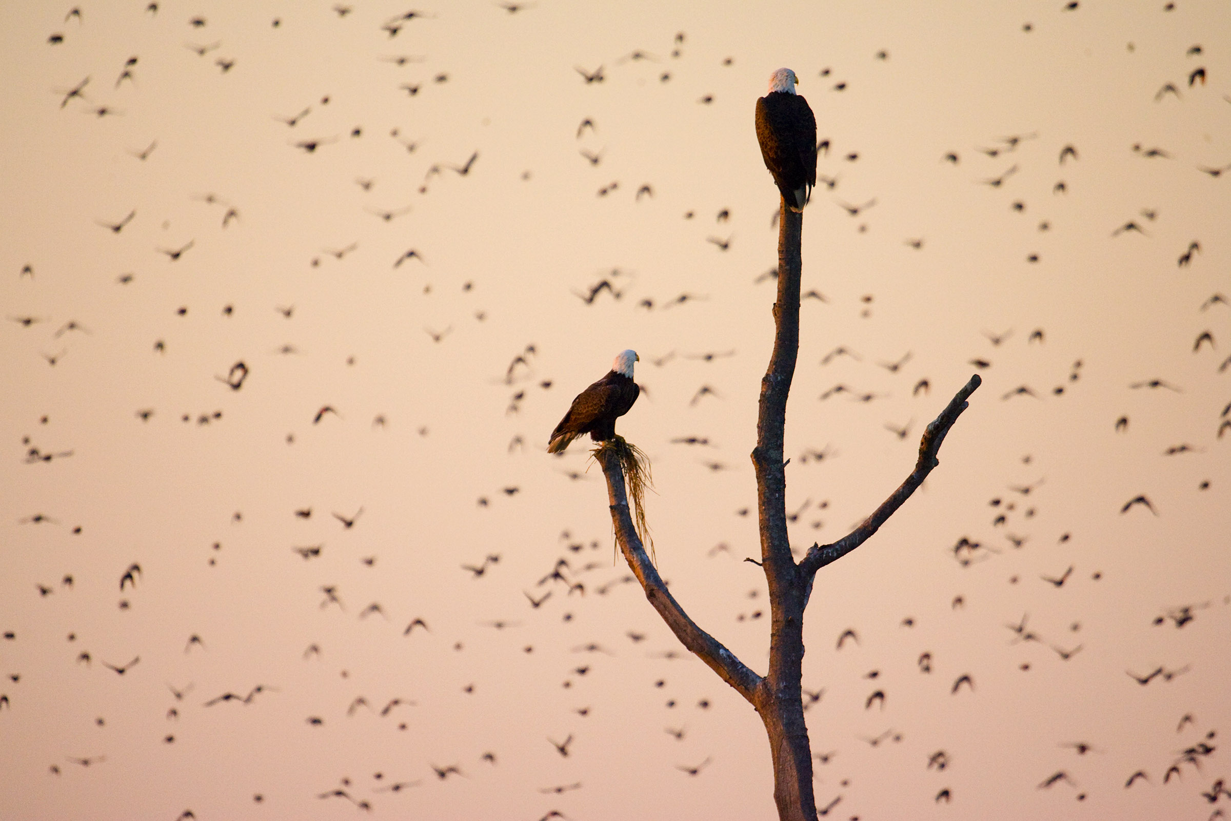 An image of a pair of Eagles surrounded by a swarm of small birds taking flight at sunset @ Blackwater NWR. Image taken with a 300-800mm lens @ 731mm with a Canon 1Dmk II.