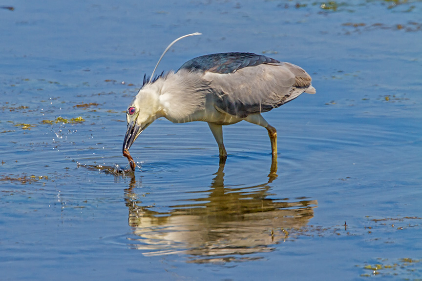 When we were leaving the Brigantine Division of the Edwin B. Forsythe National Wildlife Refuge in Oceanville NJ, we found this Black-crowned Night-heron feeding along the Wildlife Drive. It kept trying but seemed to always get some stringy vegetation instead of what it was looking for. This Black-Crown was also showing the breeding plumage, long white plumes on it’s head. Black-crowned Night-herons don’t get adult plumage until they are about three years old. We watched this Night-heron for about 15 minutes and it did not come up with a meal. We left him trying and headed home.