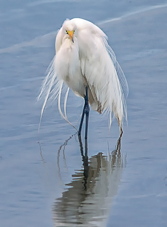 This time of year the Great Egrets are showing their Breeding Plumage. They are great to photograph showing the feathery feathers, long plumes in the back and colorful lore with green around the eyes. Depending on their position, the plumage shows up either more or less. Wait to get interesting angles, which usually does not take long as they are active birds. Also if it is windy, the feathers blow in the wind and spread out more for more impact. They are also large birds which helps fill the frame.